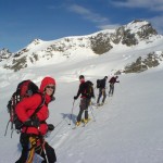 Nachdem wir den Gletscher überquert hatten, stiegen wir über die Flanke auf. Anfangs noch nicht steil gingen wir über den eisigen Hang hinauf. Weiter oben waren einige Wechten, die es zu überqueren galt. Noch immer waren wir in dem steilen und harten Gelände mit den Skiern unterwegs. Stürzen war nicht drin, da es auf der rechten Seite 800m in Leere piff. Martin meinte wir sollten auf die Steigeisen wechseln. Jedoch war ein jeder so mit sich selbst beschäftigt, dass wir mit den Skiern weitergingen. Plötzlich rutschte Conny in einer Spitzkehre mit dem Fuß weg. Jürgen war zum Glück sofort zur Stelle und half ihr. Jetzt war klar – Steigeisen rauf – und weiter mit dem Pickel. Hätten wir nur auf Martin gehört, aber zum Glück ist nichts passiert!
