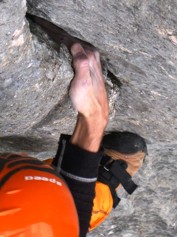 Das erste Mal hat mich Michl auf den, damals brandneuen, Camp Speed Helm aufmerksam gemacht. 2011 war das einer der leichtesten Helme, die es auf dem Markt gab. Als Michl bei unsere letzten großen Tour, der Glocknerüberschreitung, den Helm in die Randkluft geschmissen hat und dieser dort verschwand, war klar, dass ich mich früher oder später für den Speed entscheiden würde. Schließlich saß das Ding auch perfekt auf meinem Kopf. Das Gurtsystem liegt angenehm und stabilisiert den Helm, sodass dieser selten schief sitzt. Der Kinnriemen ist gepolstert und mit einem Rädchen lässt sich der Helm problemlos im aufgesetzten Zustand verstellen. Egal ob Haube, Fließtuch oder direkt am Kopf, der Helm lässt sich extrem schnell und gut verstellen. Mit seinen 241 Gramm gehört er zu den echten Leichtgewichten, was für mich einer der größten Vorteile ist. Mit der Hybrid Konstruktion, harte Schale weicher Kern, kann er viel Energie absorbieren und ist deutlich sicherer als ein herkömmlicher Schalenhelm. Die harte Außenhülle schützt vor Beschädigungen und Steinschlägen. Eine Stirnlampe lässt sich schnell montieren und auch die Pads für die GoPro halten perfekt auf der Außenschale (eventuell mit Schleifpapier aufrauen).