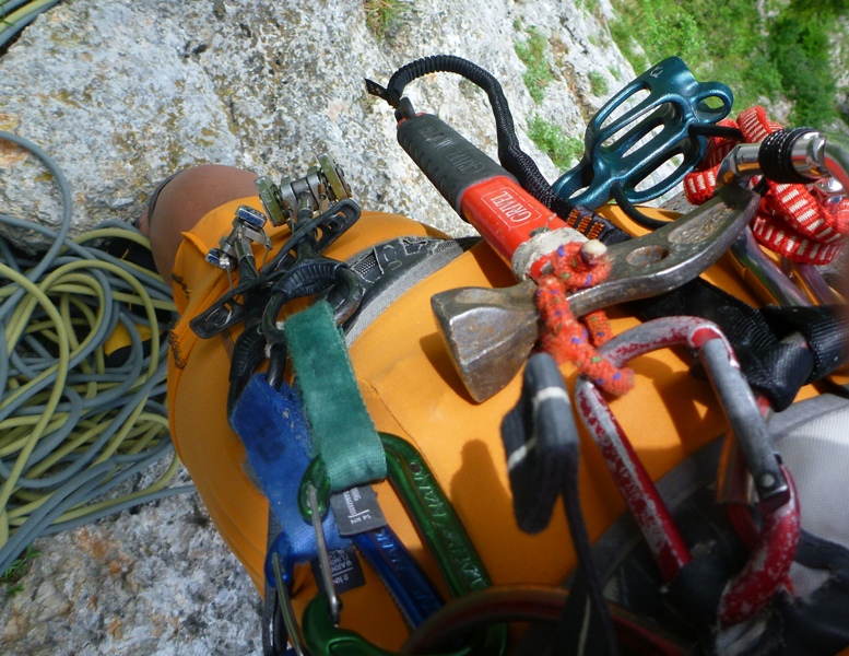 Die Leash gibt es auch in einfacher Ausführung als Slinger Leash und eignet sich perfekt für anderes Alpines Zeug wie zum Beispiel meinen Felshammer. Es ist zwar irgendwie außer Mode gekommen mit einem Hammer zu klettern, aber es gibt noch genug Routen, Touren und Linien wo ein Hammer ein echtes Must ist. Ich erinnere mich noch gut an den Horrenden Riss wo ich um mein Leben gehämmert habe… naja so schlimm war´s dann auch nicht…
