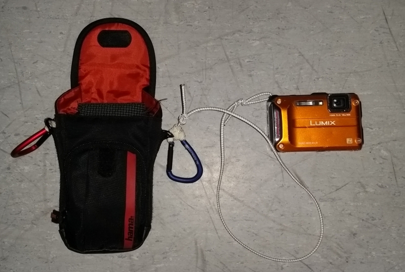 Ich habe eine Zeit gebraucht bis ich für mich das richtige System gefunden habe. Mittlerweile habe ich diese schon ein paarmal überarbeitet und nun möchte ich dieses „als Tipp“ vorstellen. Die Kameratasche dient für mich gleichzeitig als Handytasche und mit einem zweiten Fach um Geld und eine Reserve SD Karte mitzunehmen. Die Tasche selbst habe ich mit zwei kleinen Karabinern ausgestattet. Das ermöglicht mir die Tasche so an meinem Klettergurt zu fixieren, dass diese genau zwischen den zwei Materialschlaufen hängt. Somit ist mir diese nicht im Weg. Die Cam selbst habe ich mit einem Gummiband fixiert. Kann diese so nicht verlieren aber habe den gesamten Radius zur Verfügung. Vorteil wenn die Cam wieder in der Tasche steckt stört das „Bandl“ nicht. Auch wenn ich dann schnell wieder die Hände zum Sicherungsgerät geben muss oder Stress bekomme kann ich die Kamera einfach fallen lassen. Diese fällt dann gedämpft ins Gummiseil.