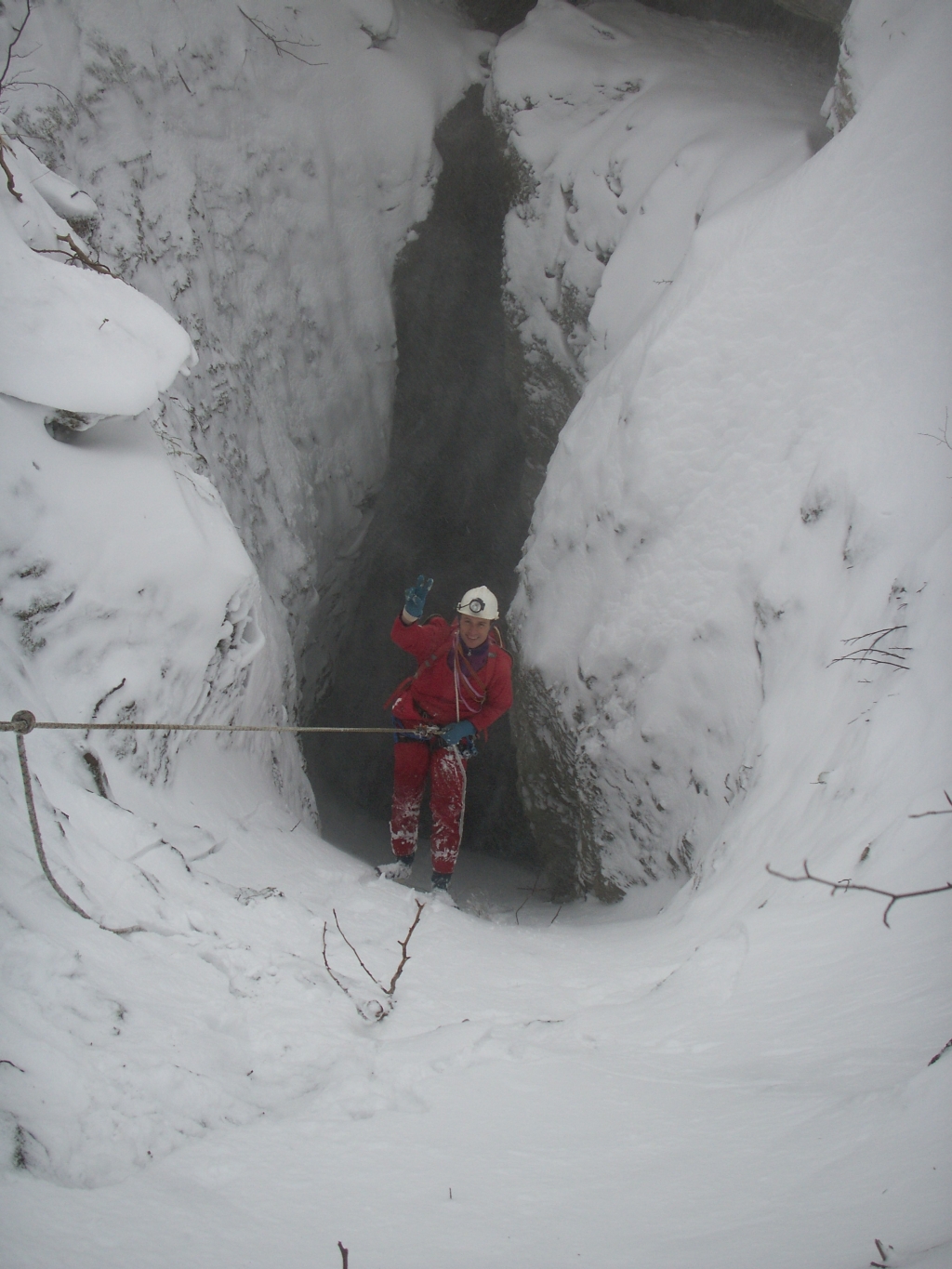 Nun machen wir uns auf den Retourweg. Wir krochen die Engstellen zurück und jümarten mit genügend Abstand die Fixseile retour. Oben lag das Seil im Schnee und ich zog mich hinauf. Auf einmal griff der Jümar nicht mehr und ich rutschte ein Stück hinunter. Puh da ist mir das Herz in die Hosen gerutscht. Ganz vorsichtig überprüfte ich beide Jümar. Die waren beide mit Eis überzogen. Shit dachte ich mir. Ich montierte oben noch die Minitraxion und zog mich langsam und vorsichtig hinauf. Oben fixierte ich mich mit einer Bandschlinge und stieg über die Absperrung. Geschafft! Als ich Martin sah konnte ich ihn noch vorwarnen. Er verwendete unter anderem die Shunt und die klemmt das Seil direkt ab. So war er sicher. Weiters machte er unterhalb ein paar Sicherheitsknoten. Weiter oben passierte ihm dasselbe wie mir, nur war er vorbereitet. Da wir vergessen hatten Material zu tauschen musste er das Schlauchboot und das Seil schleppen. Sorry Martin.
