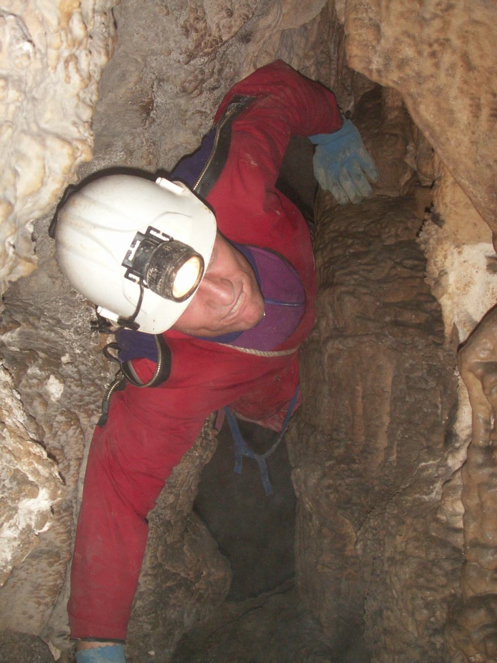 Oben gab es eine Querung und über die sollte es eigentlich auch zum Horizontalgang gehen. Wir jümarten 10 Meter wieder rauf und querten hinüber. Steil und mit dem Seilrest stiegen wir auf der anderen Seite hinunter. Bis ganz hinunter fehlten uns leider noch immer 5 Meter. Jetzt hieß es improvisieren. Wir verbanden vier Bandschlingen mittels Ankerstich und oben im schwierigen Teile die Trittleiter. Ich hatte zwar mein Bedenken, aber Martin ließ sich nicht abhalten. Er hatte die Situation im Griff. Zwei Züge und Martin war unten. Ohne Probleme wie sich nachher herausstellte. Ich sicherte mich zusätzlich mit einem Karabiner und konnte die Stelle auch ohne Probleme lösen. Dann kam die ausgesetzte Querung, die eigentlich nur Trittsicherheit erforderte. Um anschließend in das Tropfsteinkammerl zu kommen, mussten wir durch eine Engstelle. Martin war schnell durch.