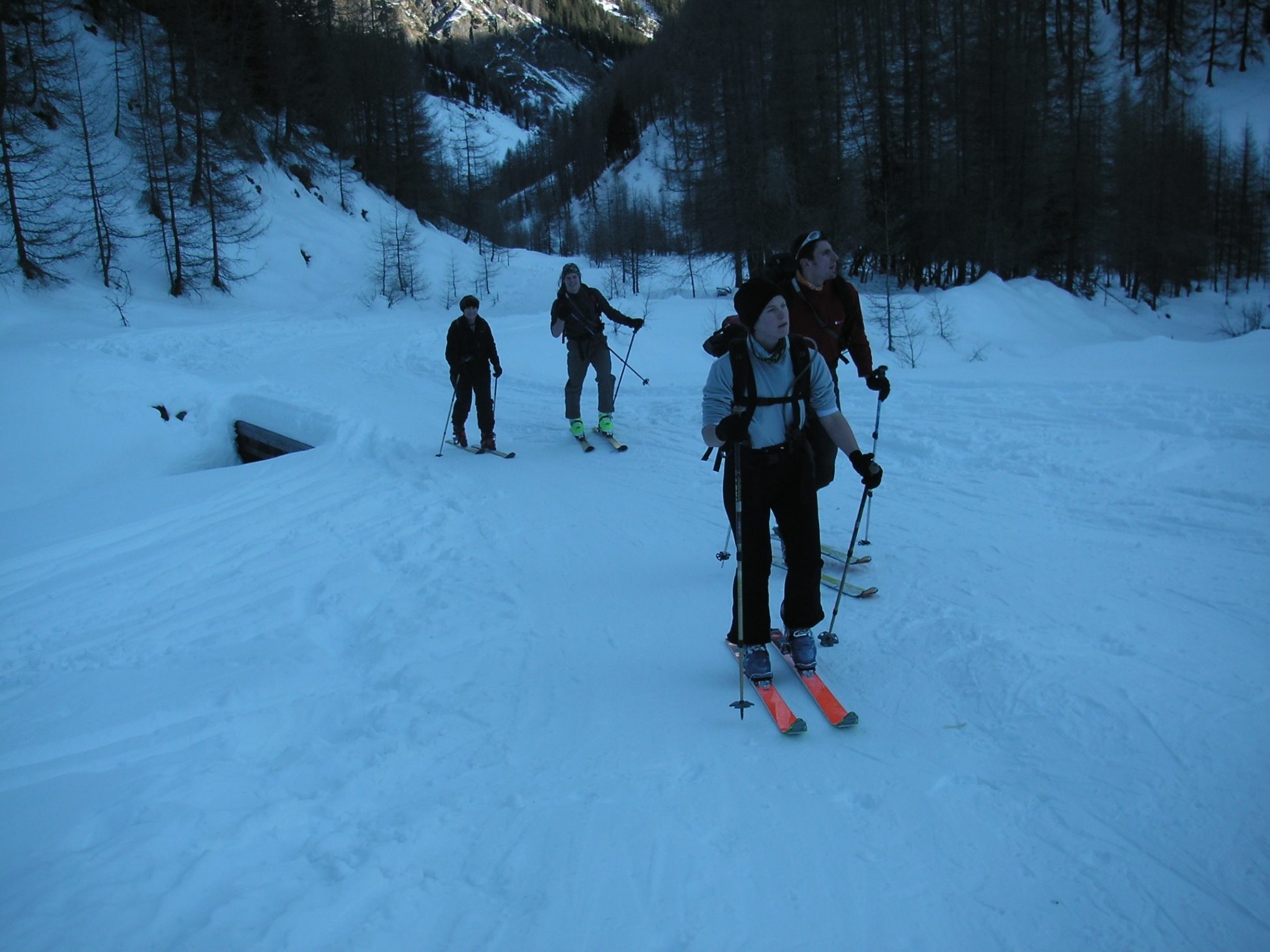In Lienz wurden wir dann von Peter´s Mum, Maria, vollgas verwöhnt. Somit war der erste Ärger schon längst verflogen. Am nächsten Morgen standen wir um 07:00 auf. Peter der Freund von Maria machte uns ein köstliches Frühstück. Wir schlugen uns die Bäuche voll und packten gut gestärkt unser Schitourenzeug zusammen. Um 07:00 wollten wir uns mit Alex und Alex´s Mum treffen. Alex kannte Peter von der Kletterhalle. Da Alex´s Mum aus Kärnten war, waren die beiden nicht weit von Lienz entfernt. Wir trafen uns beim Mäci in Lienz. Dort trafen wir auch das Lienzer Urgestein den Ander. Ein Vollblut Alpinist. Er ist der Bruder von Peter´s Mum. Wir luden das Zeug in zwei Autos und dann ging es los. Wir fuhren Richtung Silian und kurz vorher bogen wir nach rechts Richtung Pfannhorn ab. Oben am Parkplatz schnallten wir uns die Ski an, machten einen Pieps-Check und marschierten los.