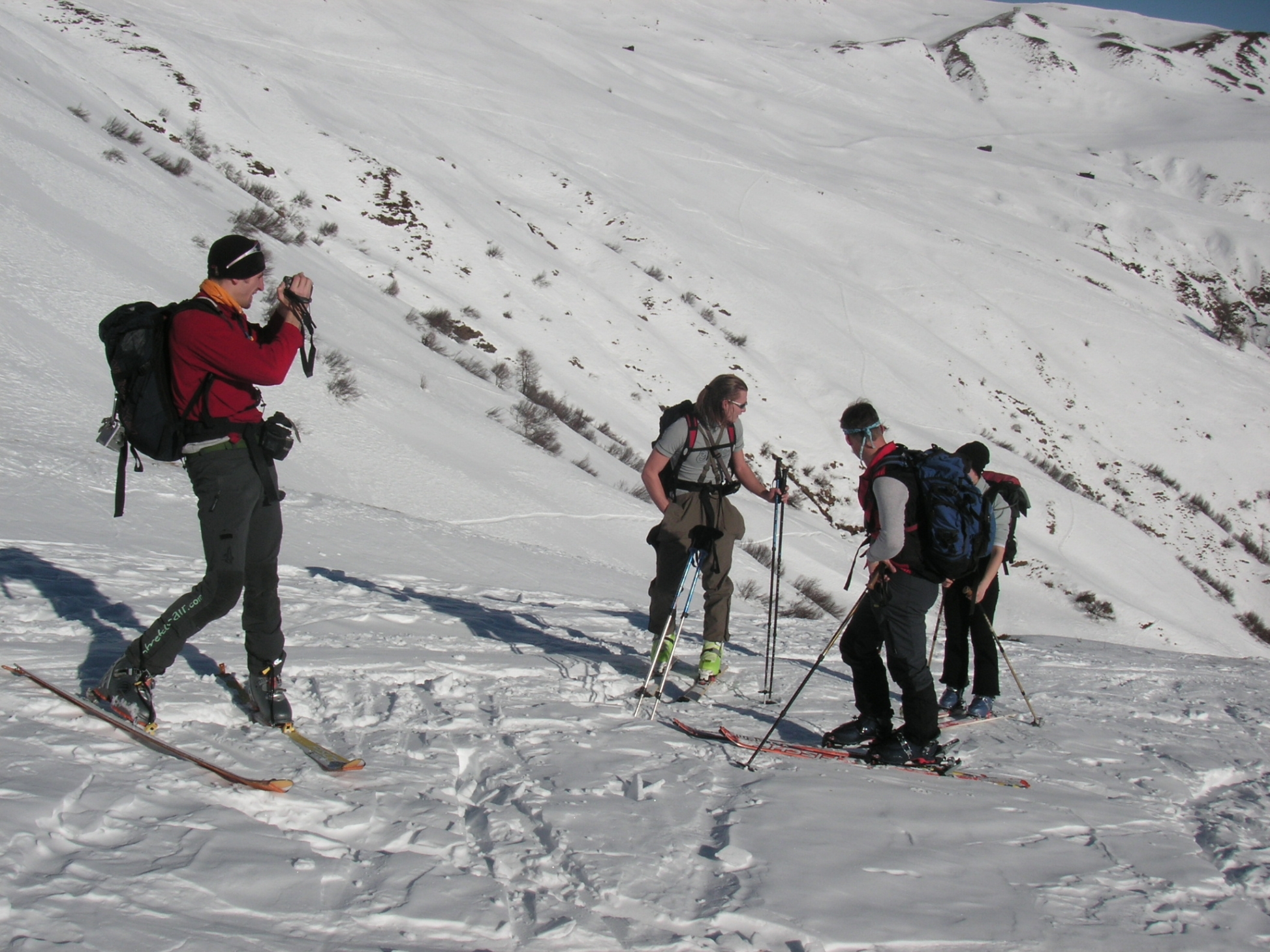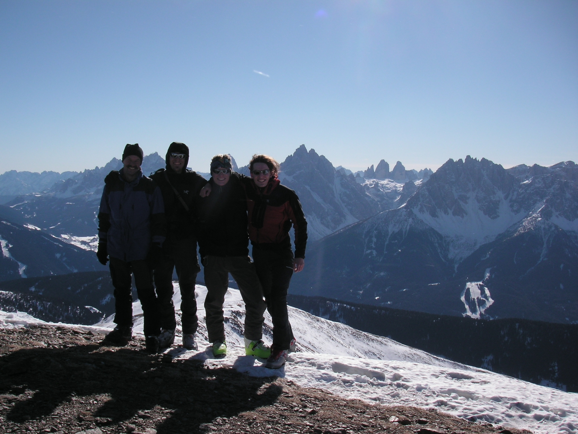 Burnie und Alex´s Mum gingen gleich Richtung Goashörndl und wir, Ander, Peter, Alex und ich zogen weiter Richtung Pfannhorn. Über den schmalen Grat und den hart gepressten Schnee zogen wir hinauf. Meine neuen Schi wurden gleich eingeweiht und bekamen die ersten Schrammen. Ich versuchte den Felskontakt so gut es ging zu vermeiden, was leider nicht immer möglich war.