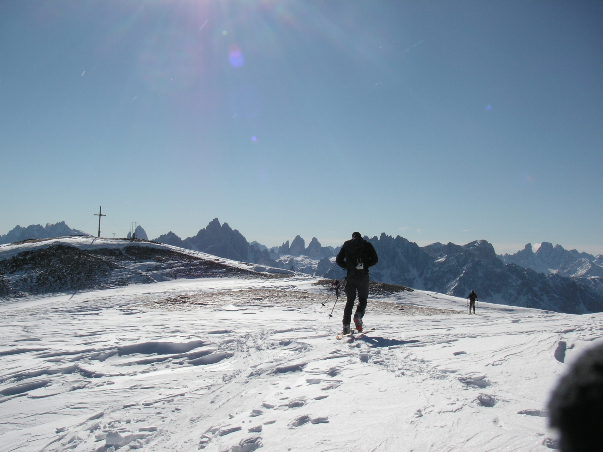 Die ersten Schritte im Schnee. Ein Genuss! Die kalte und frische Luft ließ alle Probleme verschwinden. Wir plauderten und hatten viel Spaß. Weiter oben kam dann noch die Sonne dazu und wir hatten ein traumhaftes Wetter. Oben auf einem kleinen Plateau gab es die Möglichkeit links über einen Grat zum Toblacher Pfannhorn zu gehen.