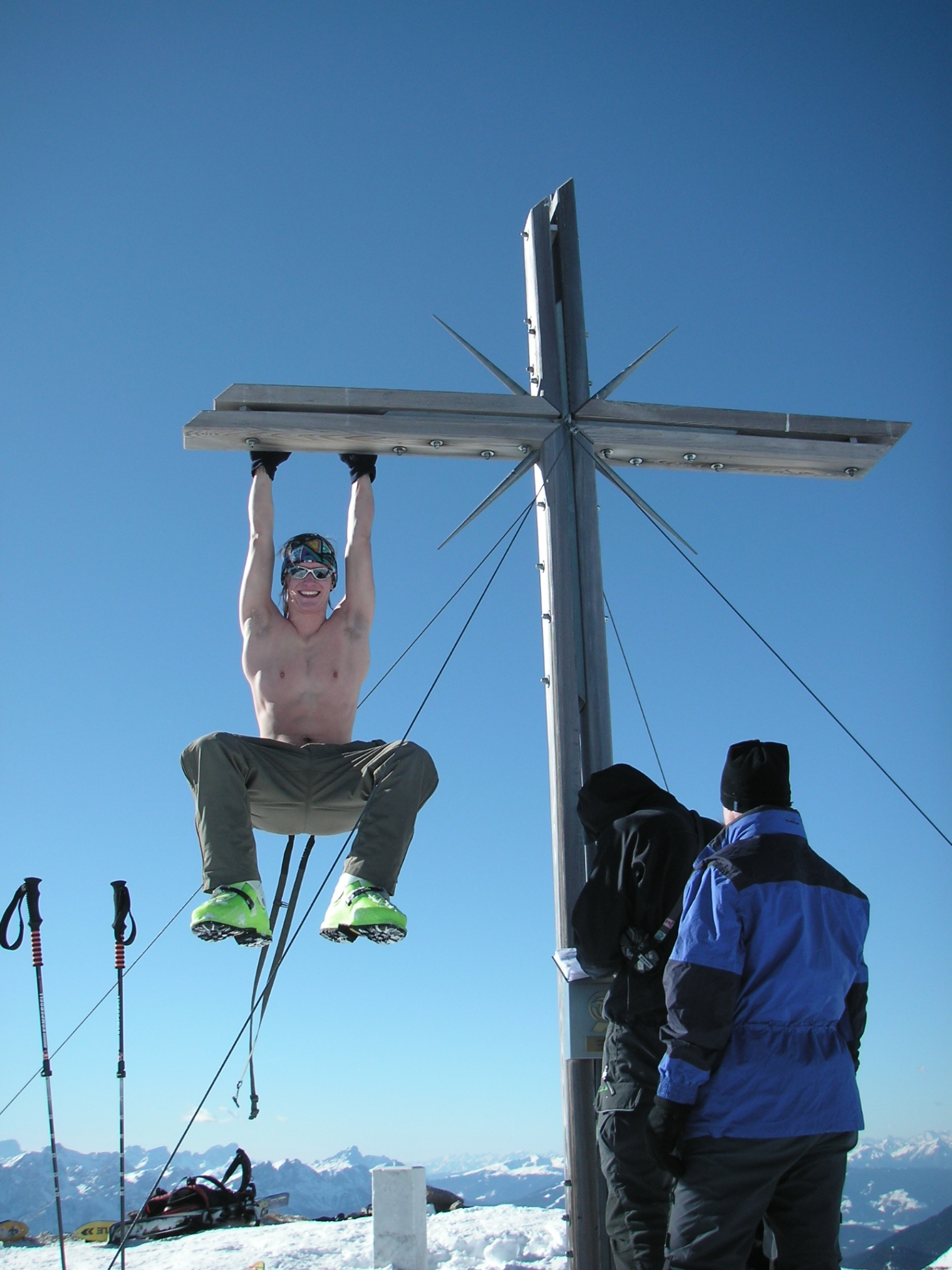 Weiter unten schnallte ich mir dann meine Schier ab und streichelte traurig über die Wunden. Über den gegenüberliegenden Grat schnallte ich mir meine Schi auf den Rucksack und marschierte los. In 15 Minuten war ich oben am Goashörndl. Ander kam mit den Skiern hinterher. Als Vollprofi schnallte er jedoch nicht ab und stieg bis zum Gipfel mit den Skiern auf. Oben genossen wir den zweiten Gipfel jedoch war die Aussicht am ersten weit schöner. Alex machte noch ein paar Klimzüge und genoss die Sonne.