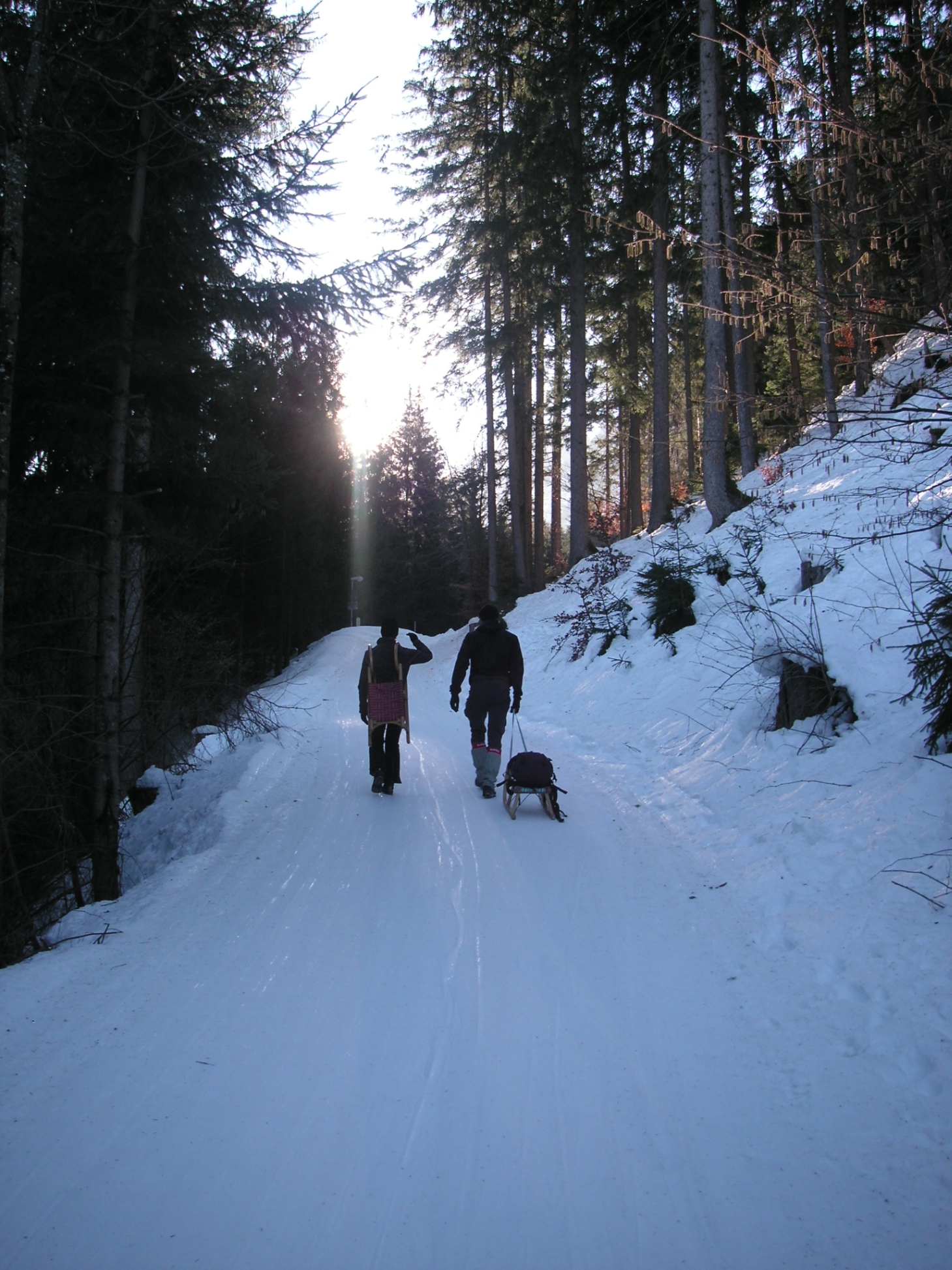 Am nächsten Tag stand eine Rodelpartie an. Wir standen zeitig auf und frühstückten. Frühstück war wie durch ein Wunder schon fertig. Gut verköstigt fuhren wir Richtung Tristach. Von dort stiegen wir über die Rodelstrecke bei traumhaften Wetter hinauf zur Dolomitenhütte.