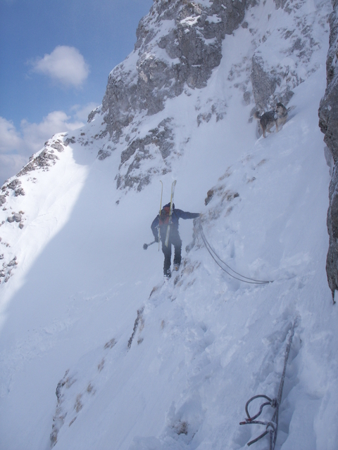 Im Kessel schnallten wir uns die Schier ab und querten an den Fixseilen zur Stahlleiter hinüber, um die steile Felsstufe zu überwinden. Für Nils, den Hund von Jürgen & Biene, war das sicher die Schlüsselstelle.