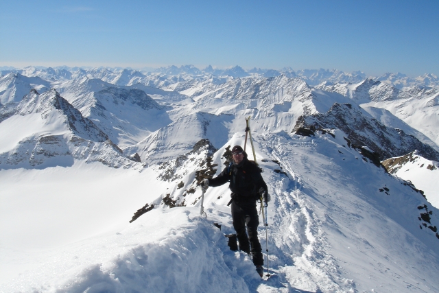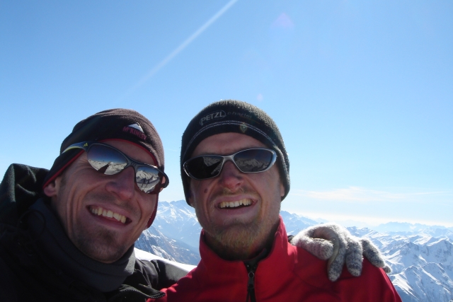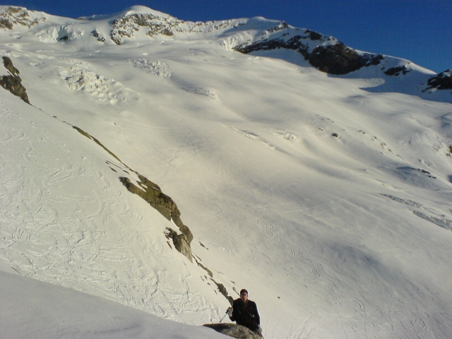 Martin, Jürgen und ich schnallten die Ski gleich an und fuhren von oben ab. Bei der steilen Wechte stieg ich gemeinsam mit Conny und Peter die ersten 10 Meter ab und schnallte erst unten die Ski wieder an. Martin und Jürgen fuhren auch über die ersten extrem steilen Meter ab. A Wahnsinn! Mit mulmigem Gefühl fuhr ich über die steile Flanke. Weiter unten wurde diese dann flacher und ich fühlte mich gleich wohler. Über den Gletscher mussten wir wieder anfellen. Nach dem Gletscher gab es noch eine Gipfelmöglichkeit, welche Martin natürlich nicht auslassen konnte.