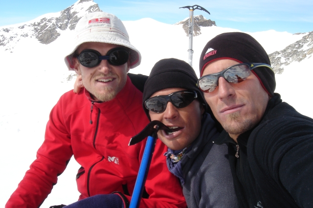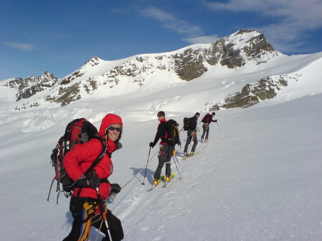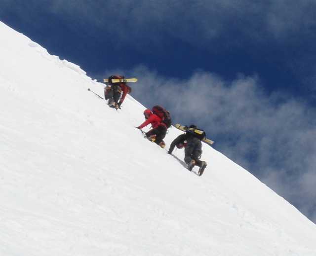 Nachdem wir den Gletscher überquert hatten, stiegen wir über die Flanke auf. Anfangs noch nicht steil gingen wir über den eisigen Hang hinauf. Weiter oben waren einige Wechten, die es zu überqueren galt. Noch immer waren wir in dem steilen und harten Gelände mit den Skiern unterwegs. Stürzen war nicht drin, da es auf der rechten Seite 800m in Leere piff. Martin meinte wir sollten auf die Steigeisen wechseln. Jedoch war ein jeder so mit sich selbst beschäftigt, dass wir mit den Skiern weitergingen. Plötzlich rutschte Conny in einer Spitzkehre mit dem Fuß weg. Jürgen war zum Glück sofort zur Stelle und half ihr. Jetzt war klar – Steigeisen rauf – und weiter mit dem Pickel. Hätten wir nur auf Martin gehört, aber zum Glück ist nichts passiert!