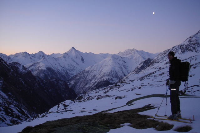 Im Dunkeln marschierten wir über die gefrorenen Spuren. Unser erstes Ziel war das Reggentörl, welches schon auf 3.047m lag. Die ersten 800hm gingen recht flott. Zwischendurch hatten wir noch einen herrlichen Sonnenaufgang.