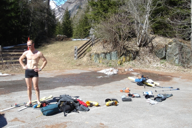 Wir fuhren bei herrlichem Schnee über den Hang ab und genossen den knietiefen Pulver. Unten am Gletscher fellten wir noch mal an und gingen hinauf zum Törl. Diesmal fuhren wir über die linke Seite ab. Dort begann der Traum von neuem. Ein Firnhang wie im Bilderbuch. Jürgen und ich genossen den perfekten Firn. Bei der Hütte angekommen, packten dann auch wir unsere Rucksäcke mit allem drum und dran und fuhren Richtung Parkplatz. Den Großteil mussten wir jedoch gehen. Am Parkplatz ließen wir dann alles fallen und legten uns in die Sonne. Wir genossen, genossen, genossen ….