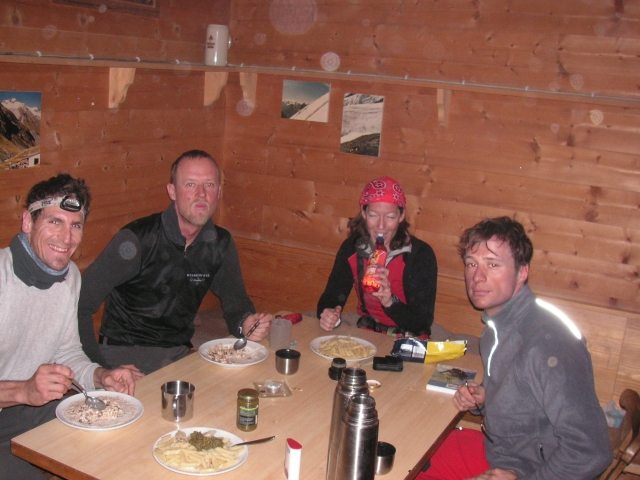 Unsere Basis war die Essener Rostockhütte auf 2.208m. Wir standen sehr früh auf, da es für Martin, Conny und Peter schon der letzte Tag unseres Wochenendes war. Um 04:48 ertönte das unangenehme Piepen des Handyweckers. Mühsam kroch ich aus meinem warmen Schlafsack und bewegte mich in Richtung Küche. Dort war schon alles vorbereitet. Der Kocher wurde in Gang gesetzt und die ersten Nudeln gleich aufgesetzt.Wie es in solchen Hütten üblich ist, liefen alle kreuz und quer und bereiteten sich vor. Zwischendurch wurde gegessen.