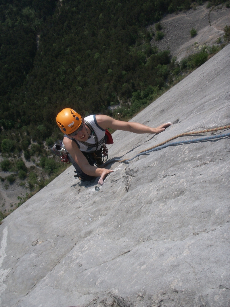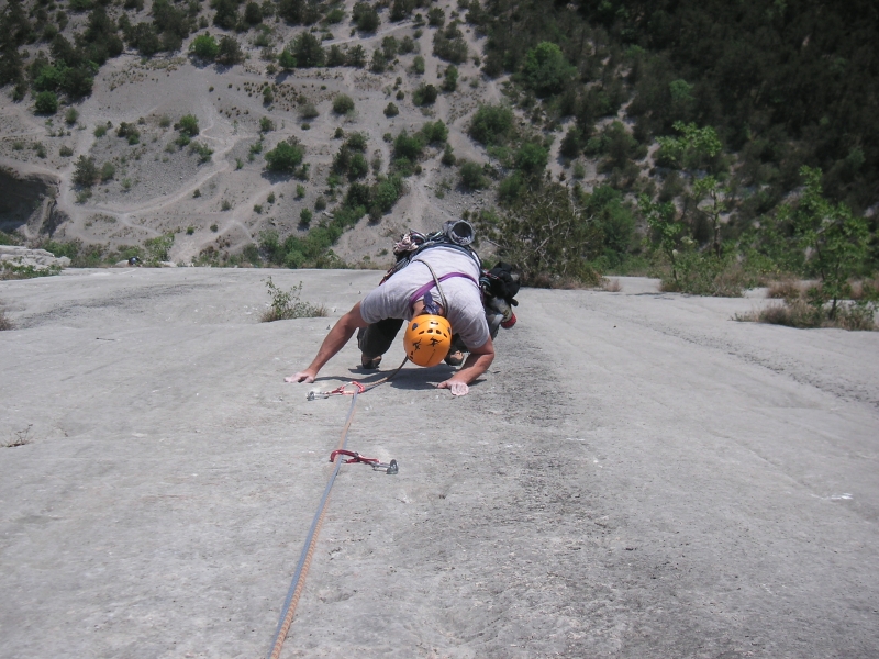 Wir stiegen sehr früh ein, da wir keine Seilschaft über uns haben und auch der größten Hitze entkommen wollten. Die ersten Längen waren recht einfach und wir kamen schnell voran. Dann kam die erste Plattenlänge. Die Sonne kam mittlerweile auch heraus und die Kletterer kamen in Scharen aus dem Wald und stiegen in die Touren ein. Wir schlichen über die Platten und hatten wirklich zu kämpfen. Teilweise gab es einfach keine Griffe. Nur Mulden und Aufleger.