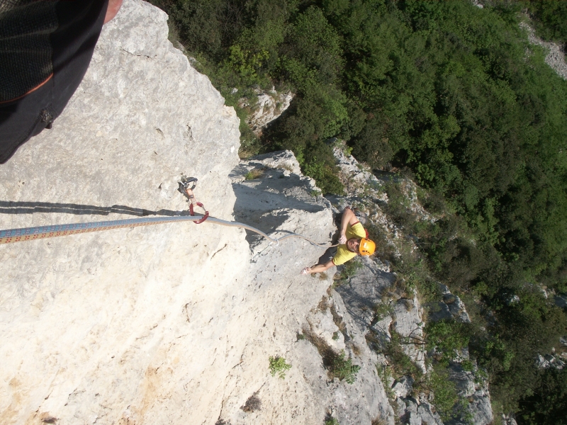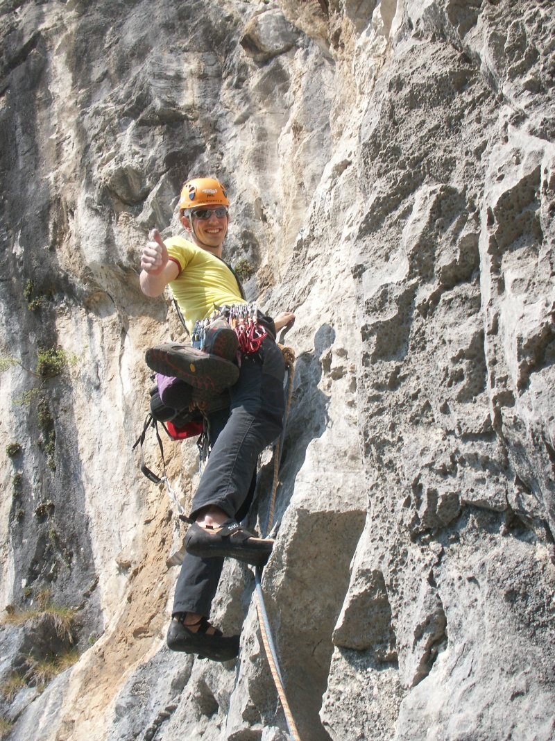 Es war traumhaft. Bald waren wir am Ausstieg und machten uns wieder zurück zum Einstieg der nächsten Tour. Unterwegs nahmen wir noch die zuvor vergrabene Wasserflasche mit und tranken noch ein paar kräftige Schluck kaltes Wasser. Unsere nächste Tour war die Tour Nemesi, welche mit 8- bewertet ist. Ich durfte die erste 8- Länge führen. Ich kämpfte mich hinauf und schwitze alle meine Sünden heraus. Gerade unten waren zwei sehr harte Züge (zumindest für mich!). Um diese Stelle zu klettern, musste ich mich ein paar mal hineinsetzen, aber ich schummelte mich dann irgendwie drüber. Peter stieg recht souverän nach. Unten musste er auch kurz Rasten, aber auch nur, weil ihm der Fuß wegrutschte. Die zweite Länge war eine harte 7+ wie sich nachher herausstelle.