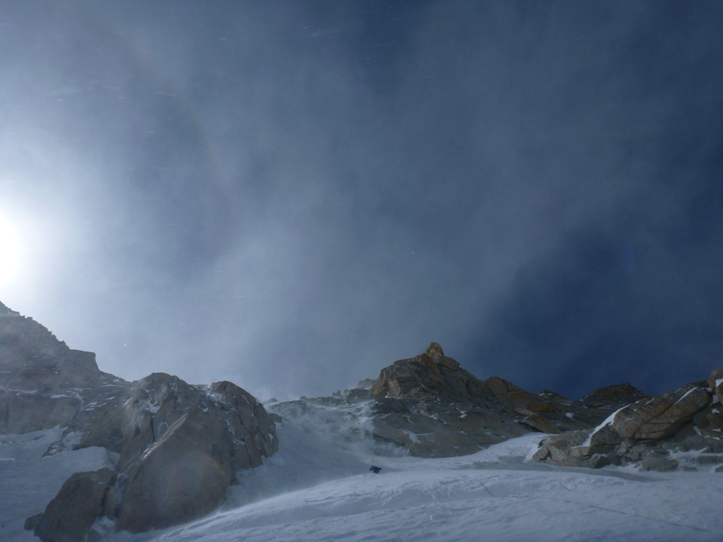 Da man von beiden Seiten ein bisschen windgeschützt ist, hielt sich auch der eisige Wind in Grenzen. Ein paar Spinndrifts von oben waren teilweise ein wenig unangenehm, aber hinderten nicht wirklich an der Kletterei. Oben entschieden wir uns nicht über den Normalweg abzusteigen, sondern wieder abzuseilen. Die Stände waren alle vorhanden und auch Abalakov Schlingen waren überall gefädelt.
