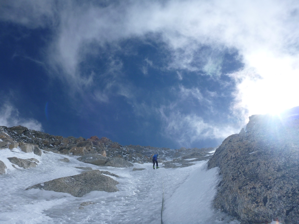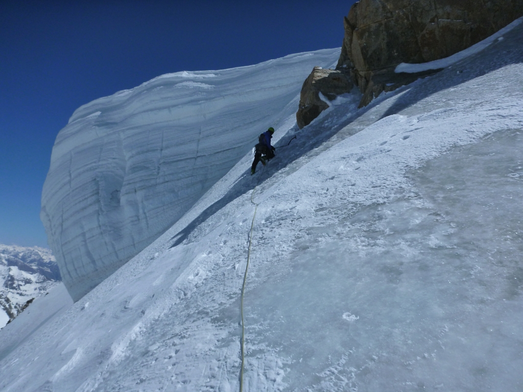 Unsere Tour startete relativ weit links und sucht sich den leichtesten Weg durch die steilen Firnwände. Wir hatten perfekte Bedingungen und gemütlich konnten wir so am laufenden Seil bis zum Ausstieg klettern.