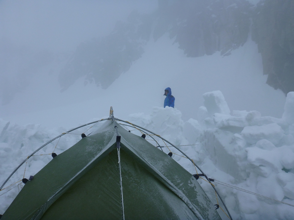 So waren wir auch schnell wieder vor dem echten Wetterumschwung unten. Die Wolken sanken tief und die Sicht war faktisch Null. Wir folgten den Spuren und kamen fast punktgenau zu unserem Zelt. Dieses war schon ein wenig eingeweht und außerdem mussten wir feststellen, dass der Wind jetzt komplett von der anderen Seite kam und wir hier noch keine Mauern gebaut hatten.