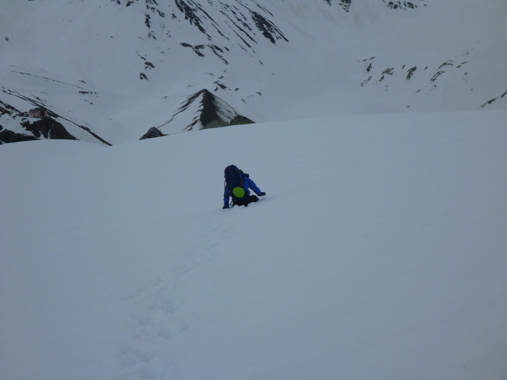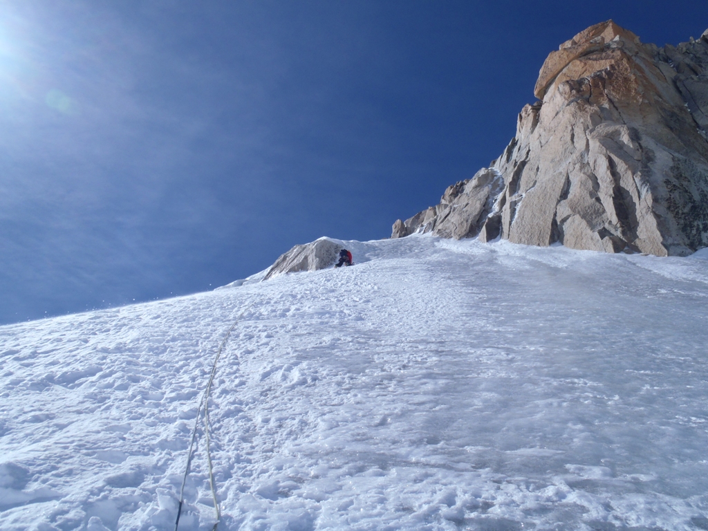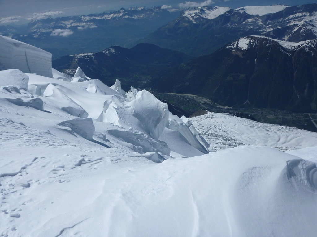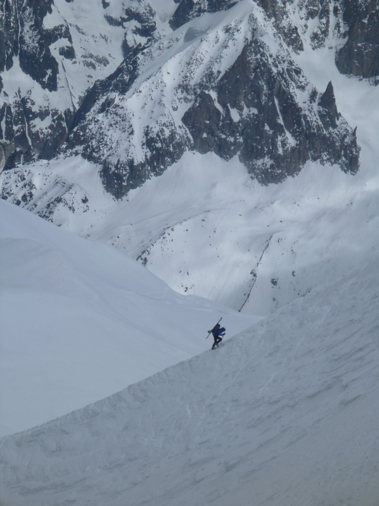 Bei bestem Wetter stapften wir zu unserem Depot, wo wir unsere schweren Rucksäcke holten. Über den mühsamen Gegenanstieg ging es wieder zurück zur Aiguille du Midi. Mühsam ist der letzte Grat zur Seilbahn, aber dieser war so gut gespurt, dass ich mir sogar die Steigeisen sparen konnte.