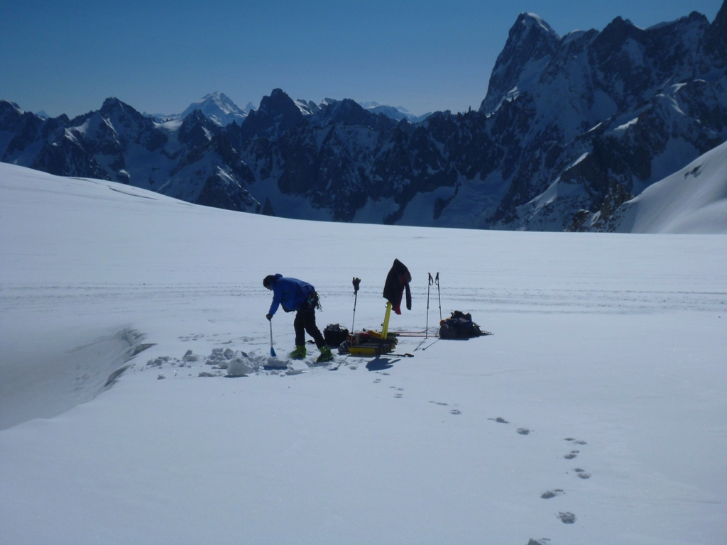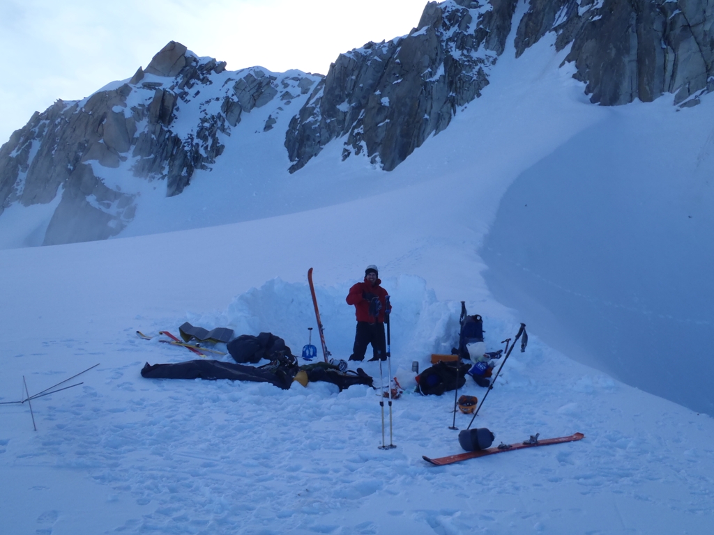 Am nächsten Morgen nahmen wir die erste Bahn hinauf auf die Aiguille du Midi (3.842m) und das bei bestem Wetter. Mit unseren riesigen Rucksäcken beeindruckten wir einige Japaner, die scheinbar nur auf einen Kaffee und ein paar Aussichtsbilder scharf waren. Wir stiegen mit Steigeisen den Grat hinunter und wechselten dann auf die Skier. Von dort ging es auf den Gletscher (Col du Midi 3.532m), wo wir unser Zeug bunkerten und weiter Richtung Nordwand vom Mont Blanc du Tacul, dem berühmten „Triangle“ vom Mont Blanc du Tacul.