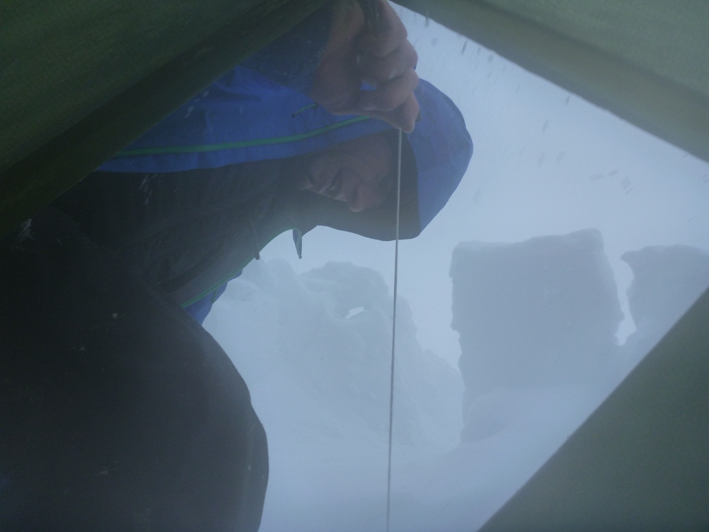 Wir spannten die Abspannleinen nach und fixierten drei weitere Sturmleinen. Dann bauten wir uns eine richtige Festung. Alfred baute noch ein paar Windbrecher vor der eigentlichen Mauer auf, um den angekündigten Sturm ein wenig zu bremsen. Mit Kochen, Schnee schmelzen und Zeltbauen war es bald Abend und der Sturm nahm zu. Alfred kuschelte sich immer mehr zu mir, aber nicht weil im kalt war, sondern weil der eingewehte Schnee immer mehr Platz brauchte. Leider musste ich schon extrem dringend pinkeln und so war klar, dass ich auch gleich das Zelt ausschaufeln durfte.