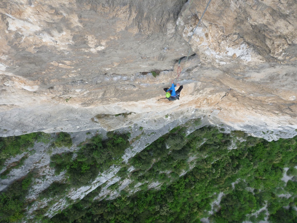 Ich sortierte das ganze Material am Gurt und kletterte in die zweite Länge. Zach, aber gut absicherbar. Nach 40 Metern war ich oben am Stand und klickte auch hier in die zwei gebohrten Standhaken. Super, die Tour ist an den Ständen saniert. Das spart viel Zeit und Nerven. Jede Seillänge hatte so ihre Tücken. In einer der 7+ Längen legte Alfred einen Hex und musste kurz pausieren. Als er diesen falsch belastete rutschte der Hex aus dem Riss und Alfred ging ab. Ein, was ich erst später sah, relativ guter Holzkeil mit Schnürl hielt seinen 3 Meter Rutscher. Ein kurzes Sch.. Hex … und drüber war er. So kämpften wir uns Seillänge für Seillänge hinauf.