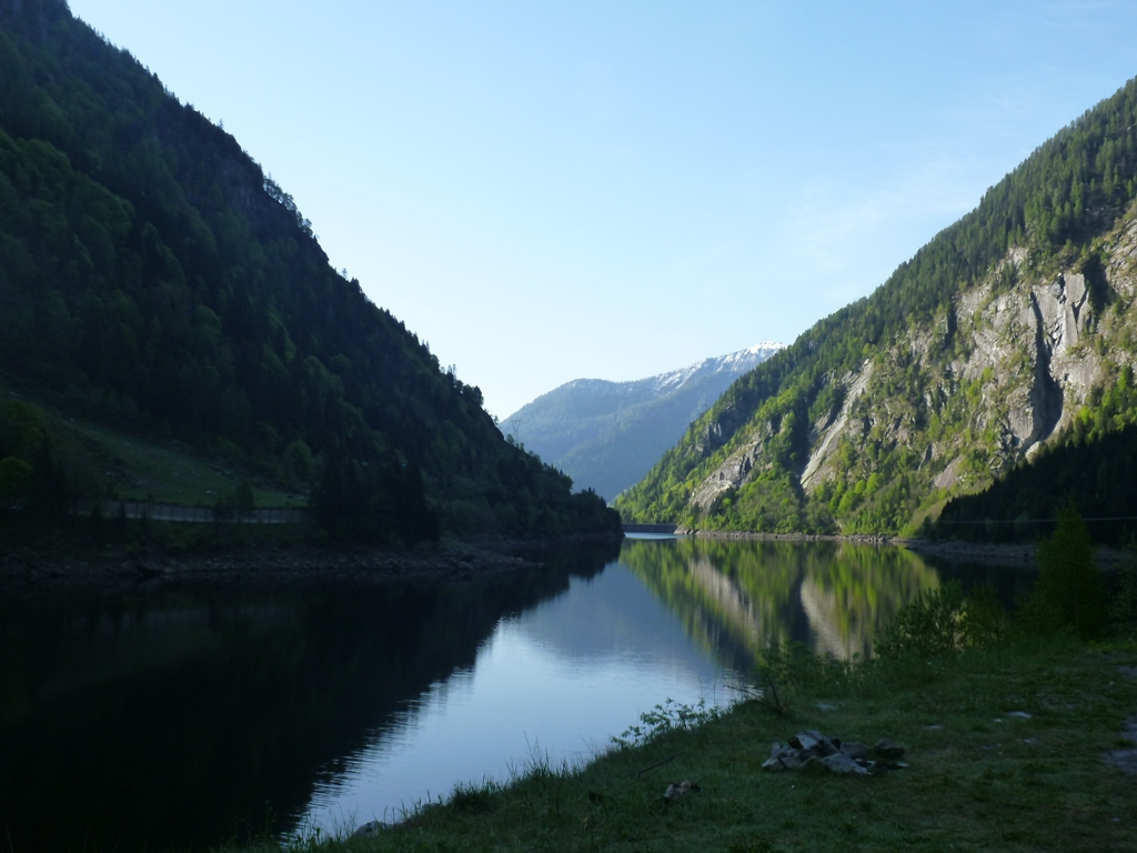 Es handelt sich um eine 300 Meter Granitriegel mit perfektem Granit, an dem auch Seilkletterer ihre wahre Freude haben. Am Abend fuhren wir zum Stausee, wo wir unsere Biwaknacht verbrachten. Der Zustieg ist relativ kurz und in 20 Minuten ist man am Einstieg der gut beschrifteten Tour (Metallplatte) Cammino degli Eternauti.