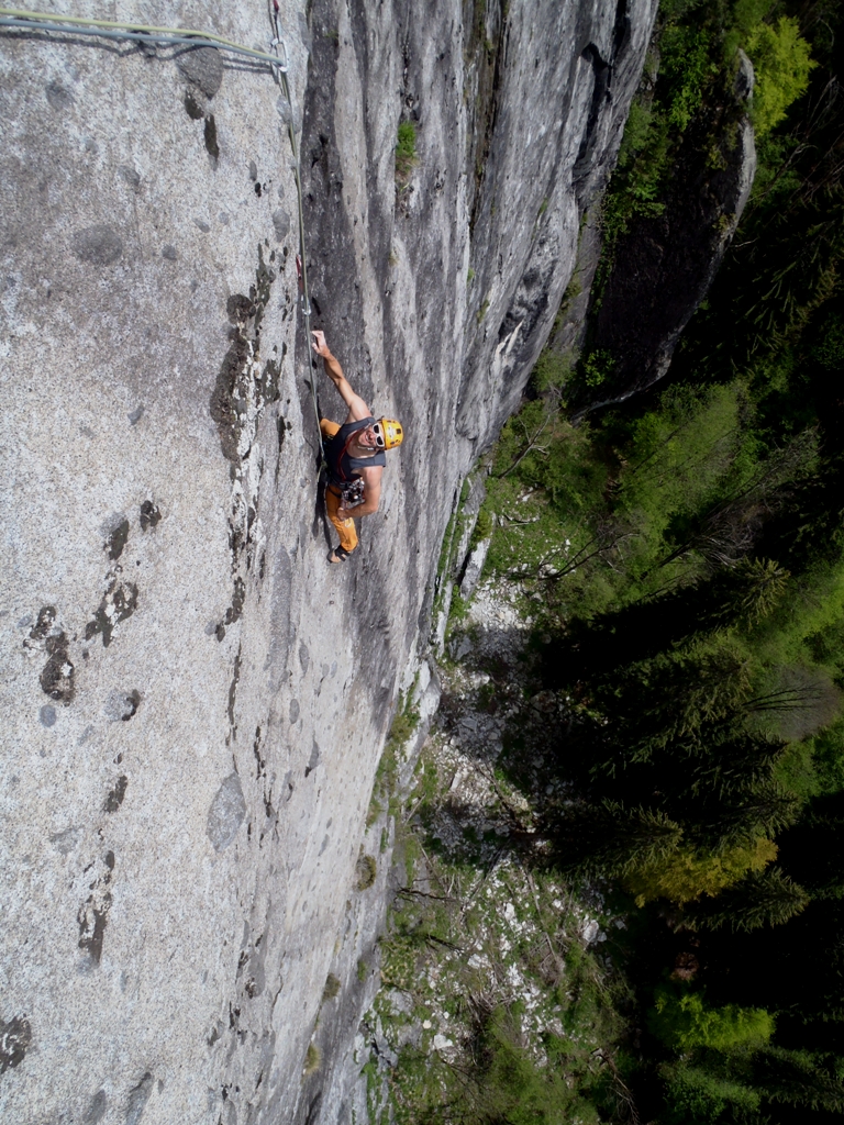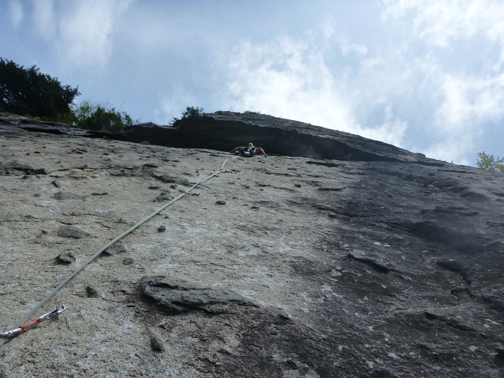 Die Tour schaut anfangs nicht sehr spannend aus. E bisschen Grünzeug und ein paar nasse Wasserstreifen kreuzten die Tour. Aber die ersten Schritte auf dem Fels lassen die Meinung sofort ändern. Granitkletterei vom feinsten. Dort wo sich die Tour nicht absichern lässt, stecken gute bzw. alte Bohrhaken (nach oben hin werden die Bolts älter) und in Rissen muss bzw. kann gelegt werden oder man klettert 10 Meter Runouts.