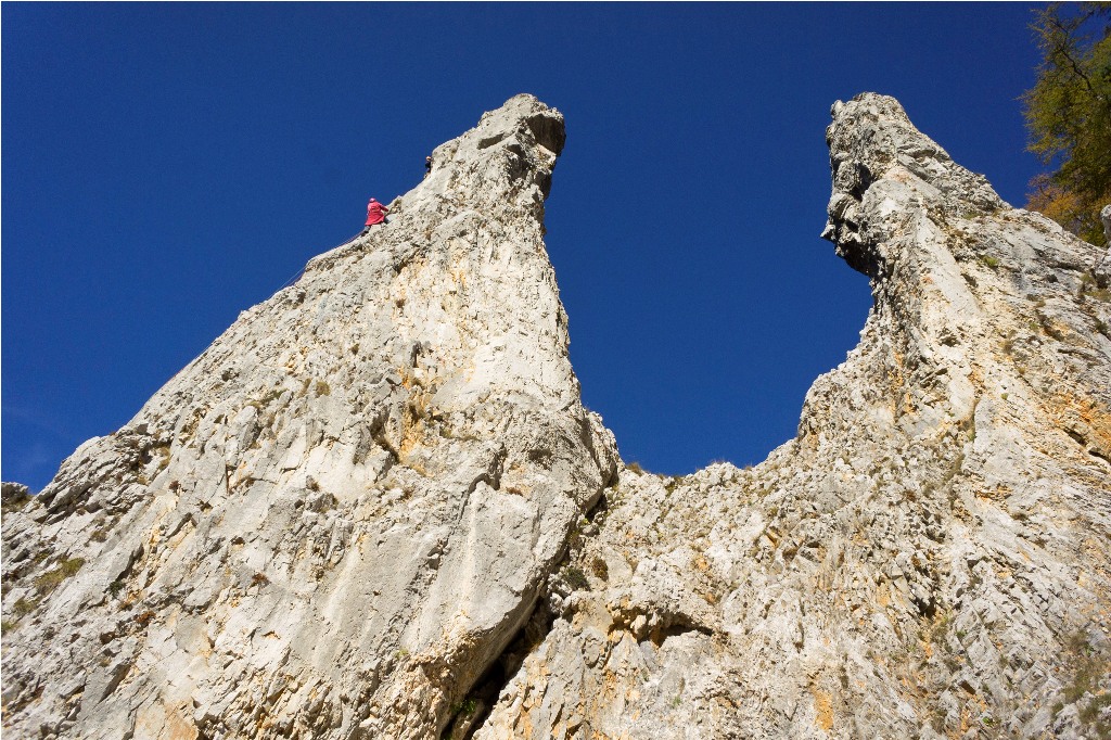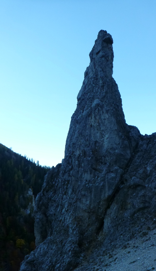 Zustieg: Forststraße (Richtung Rudolfssteig) hinauf bis diese wieder leicht bergab geht (Sattel). Von dort sind die Türme schon gut sichtbar. In einer Rinne auf altem Jagdsteig nach hinten und links über eine steile Schutthalde hinauf zum Einstieg (Fixseil bei Tanne). Von diesem nach links zum Bohrhakenstand (Bohrhaken + Sanduhr).