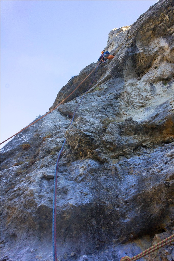 Somit konnte ich die erste schwere Stelle „angstfrei“ klettern. Bevor ich dann nach rechts in die steilere Wand zog, bohrte ich noch einen Bolt und kletterte weiter. Eine gute Köpfelschlinge und weiter. Super das war gar nicht so zach. In der guten Platte bohrte ich den dritten Bolt. Die Kletterei wurde jetzt steiler und die Griffe kleiner. Keine Chance was zu legen, zu cliffen oder sonst was zu machen. Der letzte Bolt war sicher schon 4 Meter unter mir. Puh, was jetzt? Augen zu und durch. Zum Glück war der Fels in diesem Bereich ganz gut und bei einem Felszacken gab es eine mentale Schlinge. Jetzt kam brüchiges 4er Gelände. Auch hier Augen zu und durch. Der letzte Bolt war jetzt weit unter mir. Auf einem kleinen Absatzl bohrte ich einen weiteren Bolt in der kompakten Platte. Die linke Linie gefiel mir besser, aber sah ganz schön knackig aus. Somit kletterte ich nach rechts in einen Riss, wo ich zwei alte Haken fand. Shit, da war doch schon jemand oben gewesen. Ich schlug die alten Dinger nach und dache mir klettere ich halt die Linie rauf. Aber als ich ein paar Meter weiter kletterte, war klar, dass diese derart brüchige und steile Linie garantiert keiner rauf geklettert war. Das waren Rückzugshaken. Somit musste ich wieder zurück zu meiner schwereren Variante.