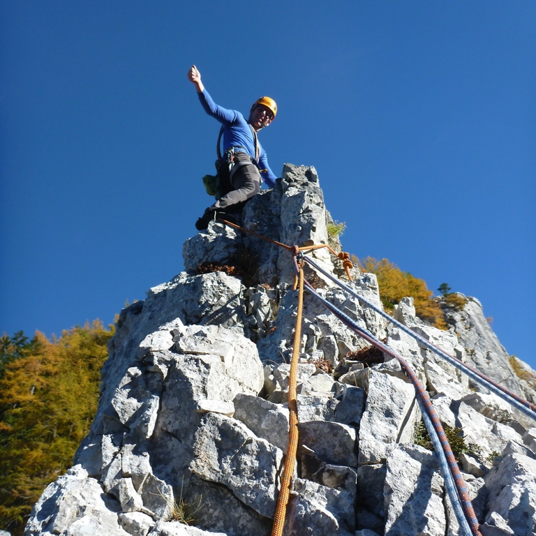 Jetzt musste ich noch Martin anbetteln, ob er mich für den Rotpunkt Versuch noch mal sichern konnte. Er gab mir gleich sein ok, was mich sehr freute. Jetzt konnte ich mit 8 Exen, 2 Schlingen und einem Abseilgerät gemütlich klettern. Die Sonne war warm und kein Geräusch. Keine Motorräder, keine Seilschaften außer uns und dem lustigen Turm. Gemütlich ging es bis zur Schlüsselstelle. Die war dann ganz schön knackig und ich glaube mit 7 ist diese ganz gut bewertet. Am Gipfel freute ich mich noch mal über meinen Rotpunkt und konnte zufrieden abseilen. Anschließend feierten wir unseren Gipfelsieg im Weichtalhaus, wo uns Willy zum Essen einlud und wir die Tour „Willy´s Wahnsinn” tauften! Danke Willy! Danke Martin!