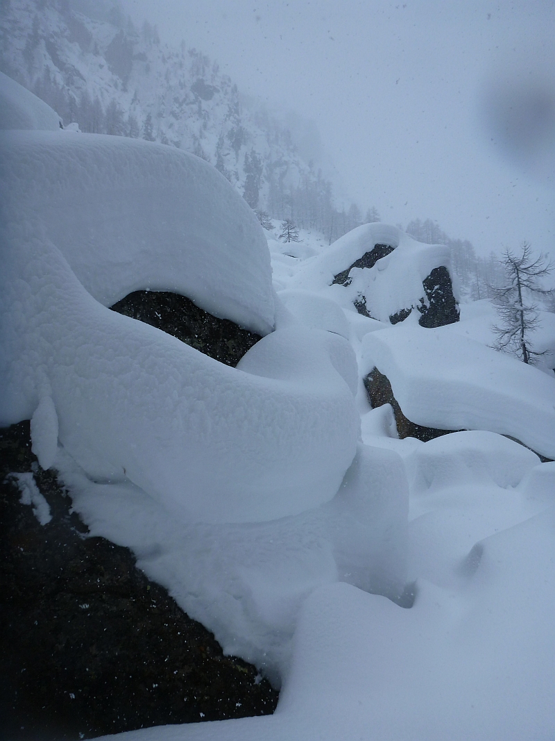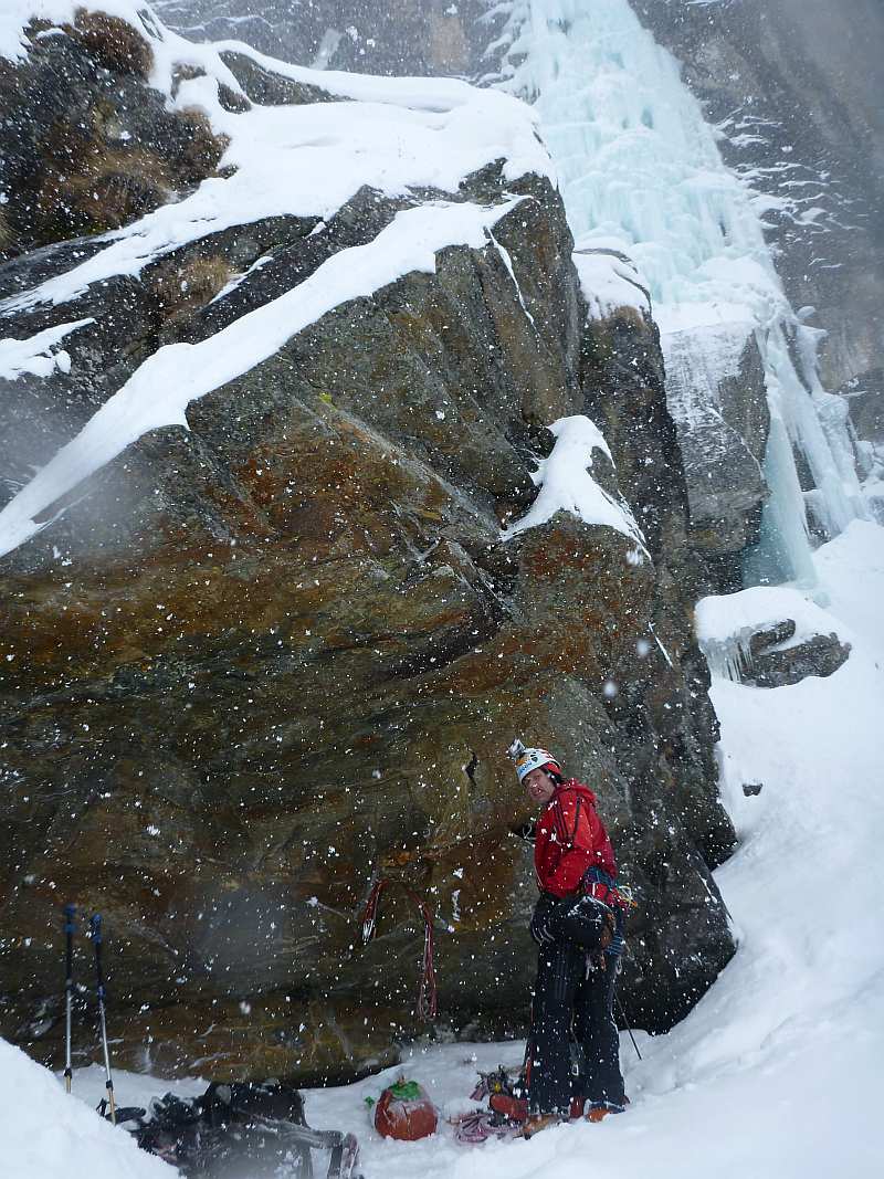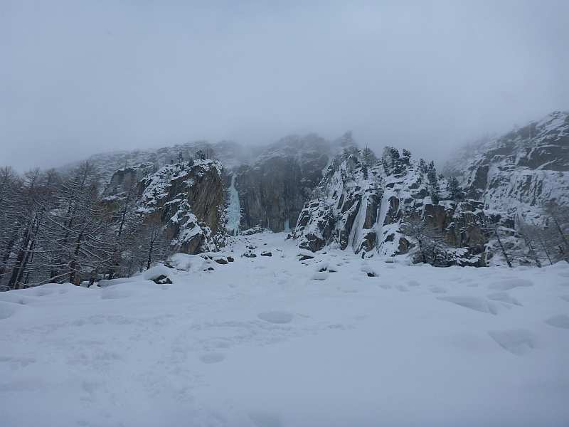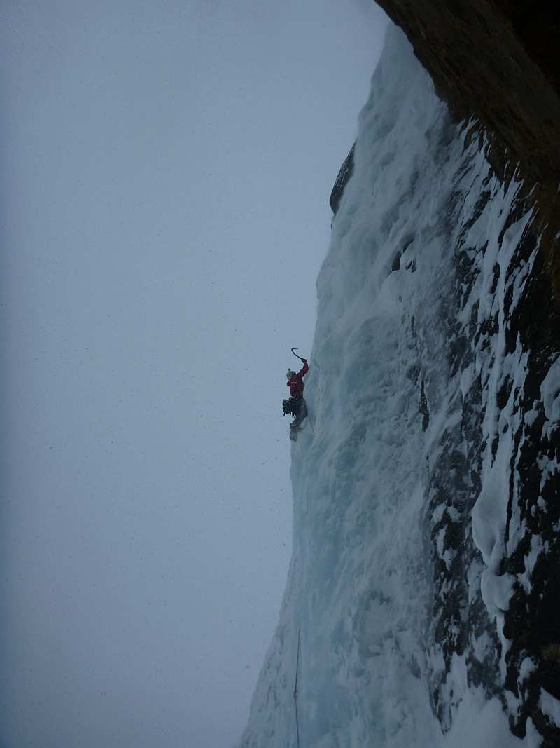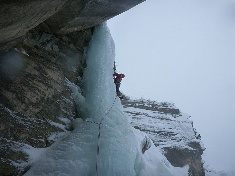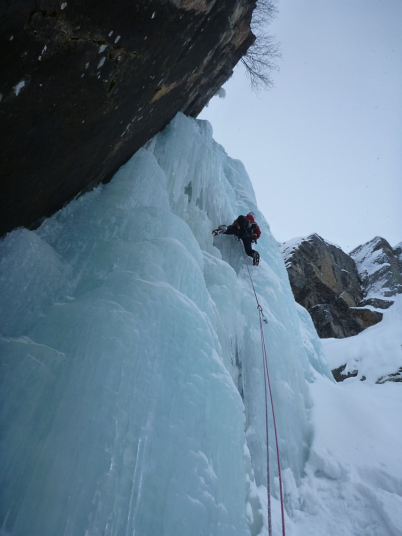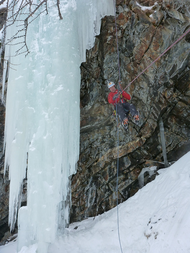 Die Sicht wurde schon etwas schlechter, was aber nicht so tragisch war. Mit einem fetten Grinser und einem „Weinwürfel“ fuhren wir wieder zurück ins Aostatal, um wieder was im Eis zu klettern. Auch dort wurde der selbige Tag voll zum Eisklettern genützt. Somit war klar, dass wir morgen was klettern können. Hubsns Schulter war auch fast wieder gut. Wir kletterten die Patrifälle in all ihren Varianten und Säulen.