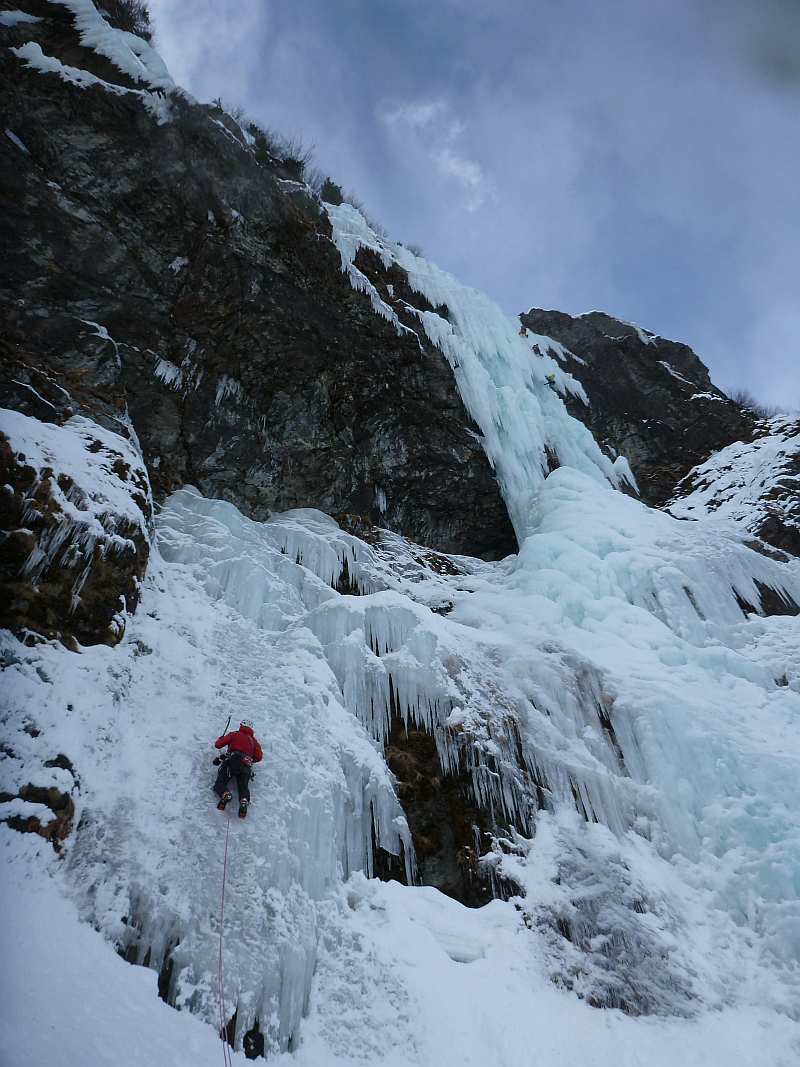 Außerdem lernten wir Benni ein wenig besser kennen und so verging die Zeit. Der Wasserfall selbst war ein Geschenk. Top Verhältnisse in perfektem Eis. So konnten wir uns eine flotte Begehung holen und überholten sogar noch eine Seilschaft. Wir verabschiedeten uns von Peter und Benni und fuhren weiter Richtung Aostatal. Dort kamen wir dann spät am Abend an, weil es am Brenner einiges an Verkehr gab. Der nächste Tag war tief winterlich.