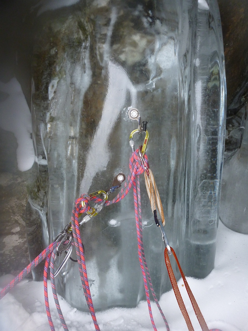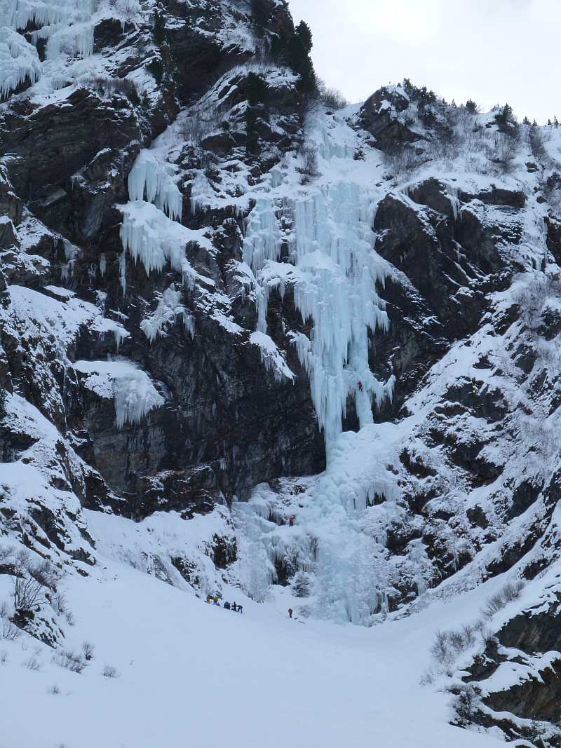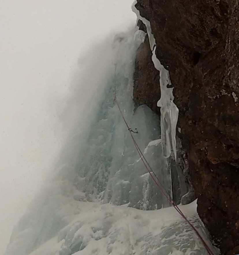 Wir starteten früher als geplant, um uns aufzuwärmen. Relativ schnell waren wir oben beim Einstieg, da der Fall relativ am Anfang des Tales steht. Oben genossen wir dann den Sonnenaufgang. Leider aber auf der falschen Seite somit konnten wir zwar Sonne sehen, aber nicht spüren. Eh kloar schließlich wollten wir ja Eisklettern. In zwei zügigen Längen zogen wir hinauf und seilten anschließend wieder ab. Als wir wieder bei unseren Rucksäcken waren gab es bereits großen Andrang. Vier Seilschaften wollten den Fall klettern.