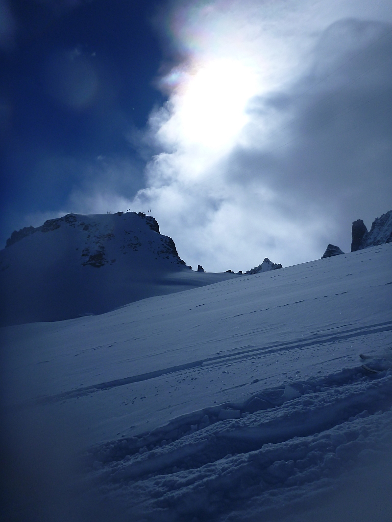 Ein wettertechnisch perfekter Donnerstag, aber so hat es leider nicht angefangen. Am Morgen holten wir uns die Karten für unsere Gondel. Leider war noch kein Betrieb möglich, da es zu viel Schnee in die obere Gondelstation geweht hatte. Auch der Wind zog oben auf seinen 3800 Meter starke Schneefahnen. Somit war alles auf „hold“. Weiters gab es eine Warteliste und wir konnten erst mit der Gondel Nr. 30 fahren was zu diesem Zeitpunkt (08:00) einen Start um 13.30 bedeutete. Naja, auch egal Hauptsache einmal das „Vallée Blance“ fahren, dachte ich mir.
