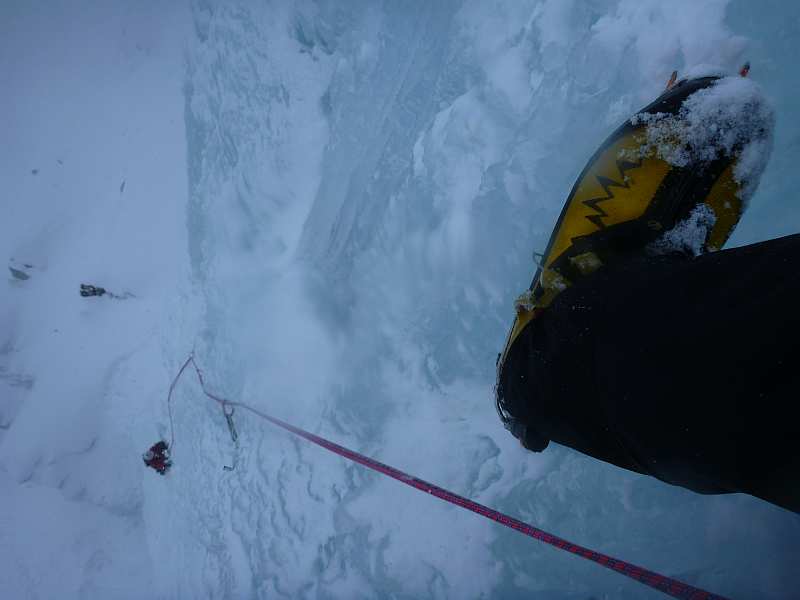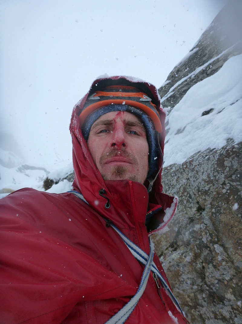 Souverän kletterte er die nächste steile Länge und machte unter der Säule Stand. Ich hatte genügende Power und Reserven und so zog ich in die nächste schwere Länge. Um ein gutes Gefühl zu haben, kletterte ich mit ganz dünnen Handschuhen, was mir weiter oben leider zum Verhängnis wurde. Als ich die Länge schon fast geknackt hatte, kamen von oben ein paar fette Spindrifts, die teilweise ganz schön Power hatten.