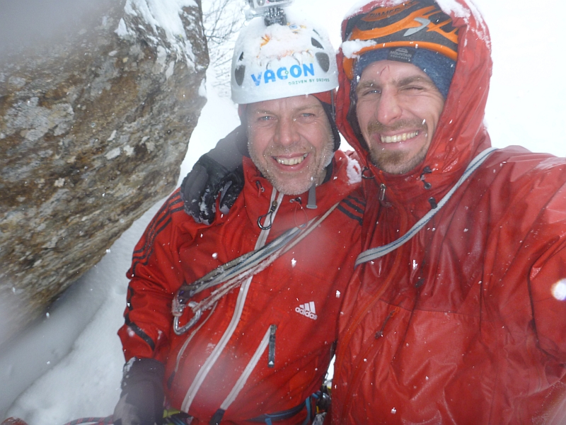 Hubsn hatte ein wenig mehr Glück, aber einen Spindrift musste er auch schlucken. Die restlichen Seillängen waren dann ein wenig leichter. Am Ausstieg war dann alles flach und keine steilen Hänge, was die Situation sehr angenehm machte, da sich die Lawinensituation nicht gerade beruhigte. Visasvis donnerte es immer wieder und über die steilen Hänge rutschen gewaltige Dinger ab.