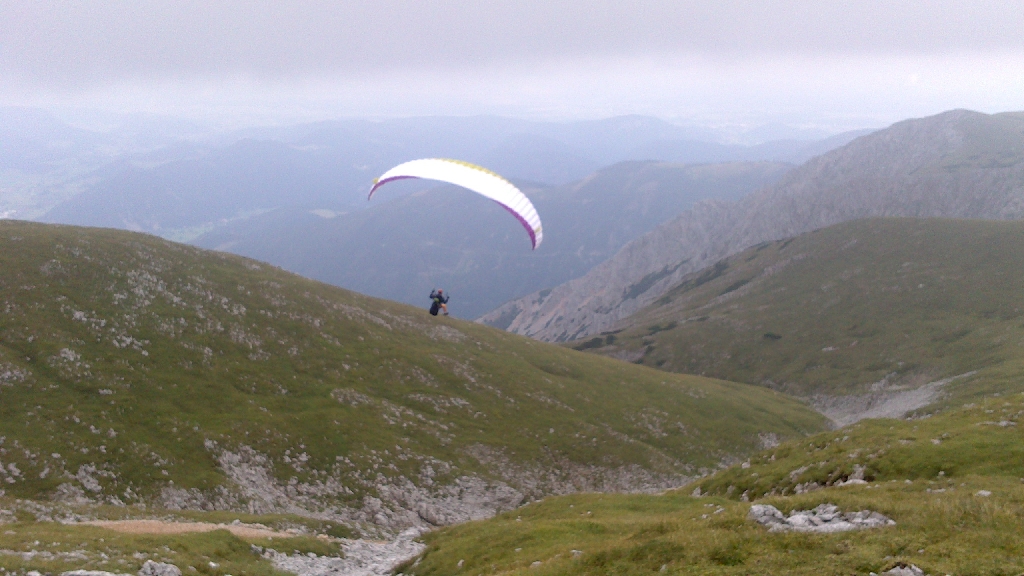 Ich steuerte gerade Richtung Schneidergrabe und der Aufwind zog mich nach oben. Um nicht in die Wolkendecke zu kommen, klappte ich meine Seitenflügeln – „Ohrwaschln“ – ein. So konnte ich gleich einiges an Höhe abbauen. Es war herrlich. Die ganze Anspannung war wie weggeblasen und ich fühlte mich wie ein Vogel. Michl verfolgte mich mit viel Höhe, da unsere Schirme doch recht unterschiedlich gebaut sind. Bei perfektem Wind ging es Richtung Landeplatz, welchen wir vorher besprochen hatten. Diesmal war meine Landeeinteilung schon viel besser und ich landete dort, wo ich wollte. Michl flairte knapp neben mir vorbei und landete wie immer perfektest. Unglaublich. Der Schneeberg. Für mich persönlich ein ganz besonderer Moment und ein unfassbares Gefühl einen Traum verwirklicht zu haben.