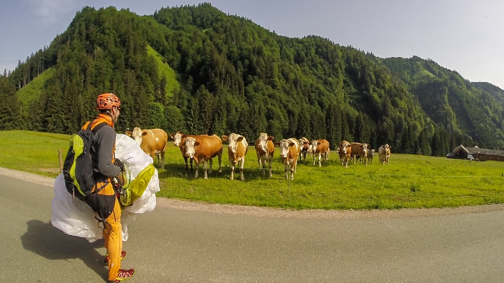 Ich war eher auf der „Großvaterschiene“ und genoss die Landschaft und den super Tag. Die Landung machte ich bei den ruhigen Verhältnissen auch ein wenig mit Speed und stand vor einer Kuhherde. Die waren an mir sehr interessiert und ich flüchtete hinter den Elektrozaun. Von dort konnte ich dann mutig die Kühe ein wenig erschrecken und raschelte mit meinen Schirm.