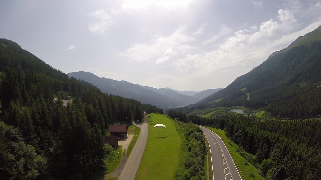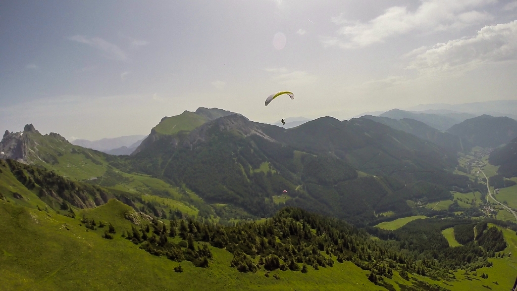 Mit einem sauberen Vorwärtsstart ging es relativ rasch Richtung Landeplatz. Wenig Wind und schöne Aussicht auf den Erzberg ergaben einen super Abgleiter. Auch die Landung war perfekt und gut eingeteilt. Zusammenpacken und wieder rauf mit dem Lift. Mittlerweile griff die Thermik schon ein wenig durch und wir warteten am selben Startplatz auf gute Verhältnisse. Leider nahm die Abschattung zu und die Wolken machten uns einen Strich durch die Rechnung. Somit ließ die Thermik nach und der Wind war sehr schwach. Wieder wurde es ein Abgleiter, aber wir ließen nicht locker und fuhren nochmal rauf. Ist ja super gemütlich mit so einem Sessellift.