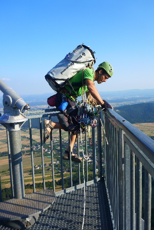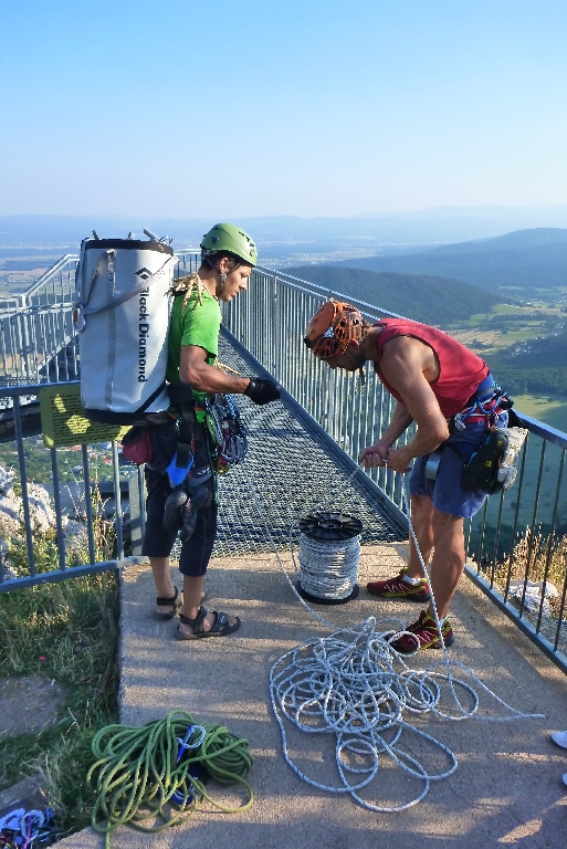 Ich setze das Ding als Projekt auf – ist ja schließlich auch mein Job – und somit gab es eine akribische Planung. Wir checkten die Seillängen und Schlüsselzüge aus, zählten alle Exen, die Länge der Exen um eine guten Seilverlauf zu haben und ein Einfachseil welches gerade so lang sein sollte, wie die längste Seillänge. Weiters benötigten wir ein 150 Meter Statikseil, um vom Skywalk möglichst rasch zum Einstieg abseilen zu können. Essen, Trinken, Material für die Stände und eine Projektbeschreibung bei den Einstiegen und direkt beim Ausstieg am Skywalk. Natürlich sollte es diese in mehreren Sprachen geben (damit Kletterer die ev. heute diese Route klettern wollen, nicht einsteigen).
