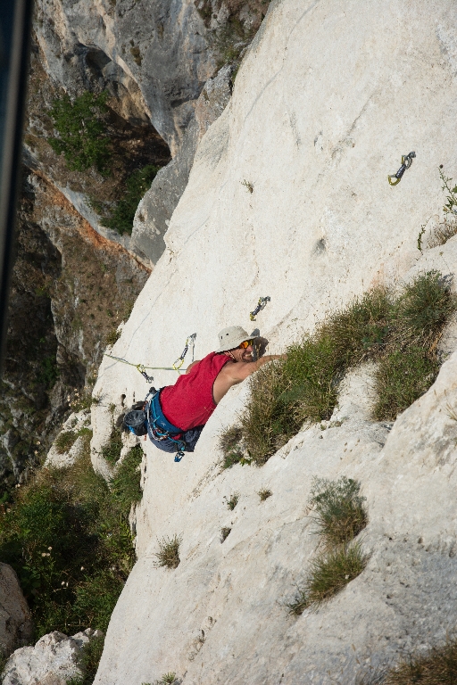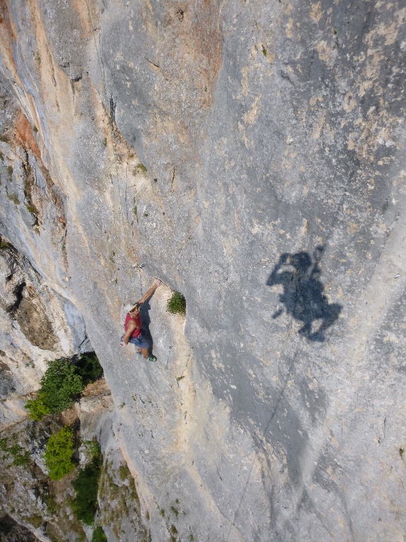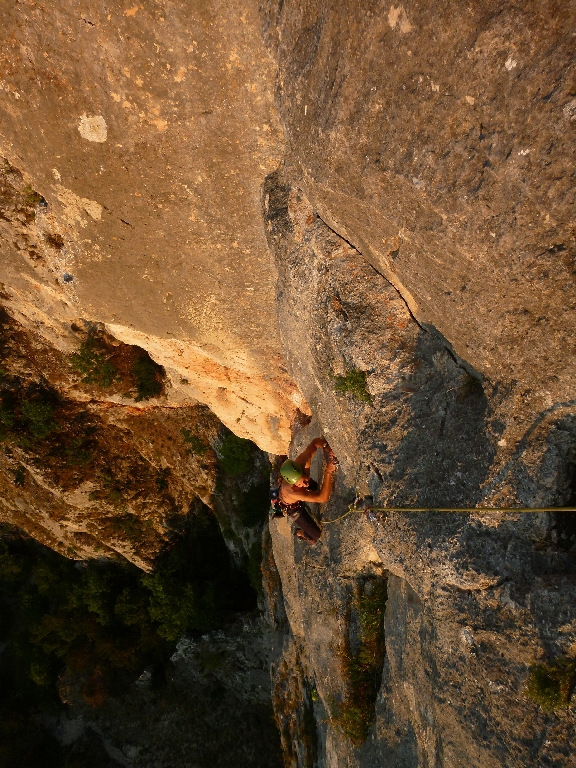 Eigentlich sind wir schon richtig erledigt und es ist sehr heiß. Aber eine Pause ist aus psychologischen Gründen erst nach der Halbzeit angesagt. Also seilen wir wieder ab und klettern unser sechstes Mal. In der letzten Seillänge rutscht mir der Fuß von der Platte und ich kann die Leiste nicht mehr halten. Oli sichert mit etwas mehr Seil und so lande ich direkt auf dem Grasband. Glücklicherweise lande ich wie eine Katze und so kann ich gleich weiterklettern.