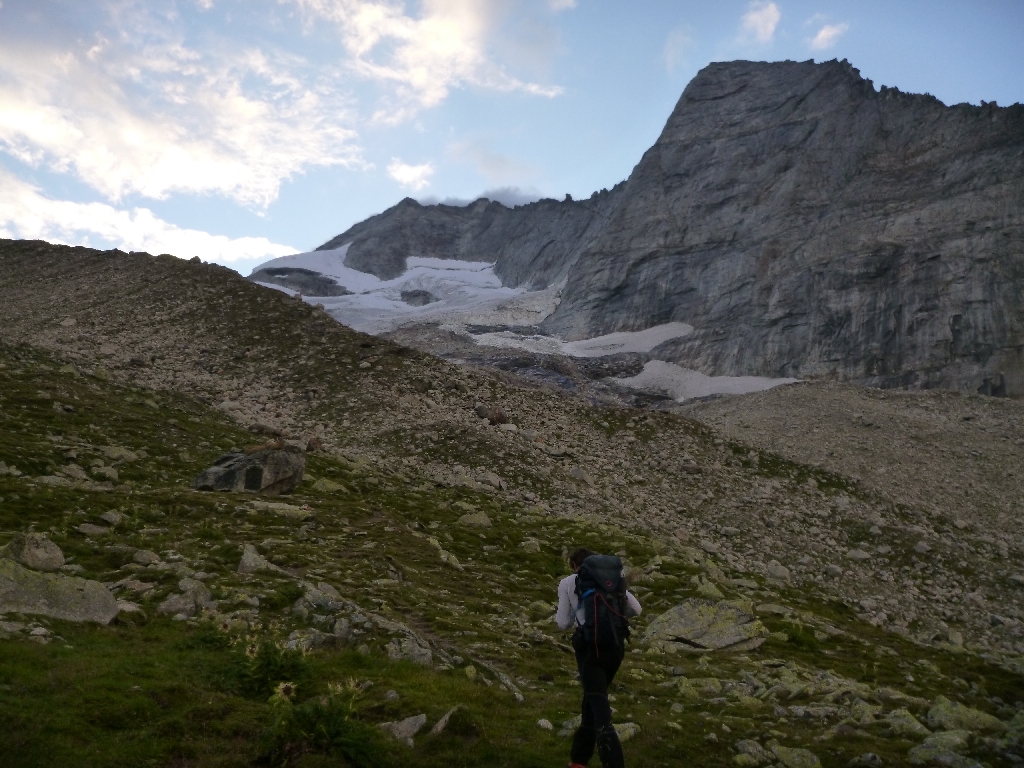 Am nächsten Morgen wollten wir die Fussstein NO-Kante machen. Eine Tour, die ich schon sehr lange auf meiner Tourenliste habe. Diesmal war es perfekt und so waren wir zeitig und nach einem gutem Frühstück beim Zustieg. Die Kante sieht man sehr gut und auch den Gletscher, den wir queren mussten. Mit ein bisschen Instinkt und Vorwissen querten wir relativ hoch den Gletscher und konnten so eine gute, ja fast perfekte Linie zum Einstieg finden.
