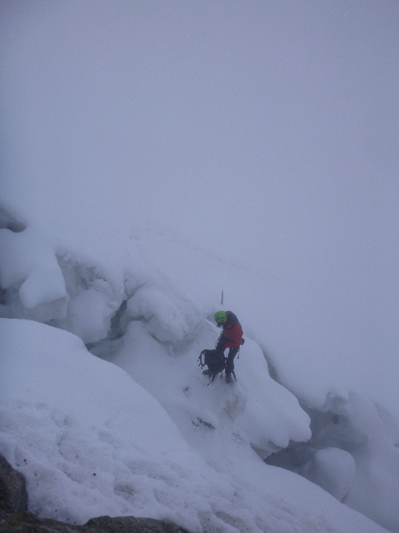 Dort sah ich recht gutes Eis und wollte es probieren, schließlich hatten wir drei Eisschrauben mit. Mit meinem abgesägten geraden Pickel kletterte ich über den steilen Eisaufschwung rauf und konnte auch die überhängenden Schneewulste gut überwinden. Ich querte oben bis zu einem Riss, wo ich einen guten Stand legen konnte.