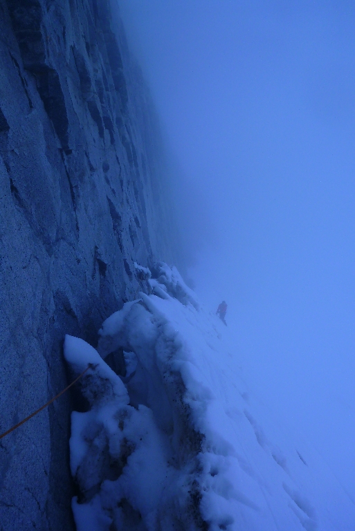 Anfangs noch schön in der Sonne kam dann immer mehr Nebel. Wir querten oben am Wandfuß bis zu einer Unterbrechungsstelle. Dort gab es kein Weiterkommen. So stiegen wir dort ein Stückchen ab und kletterten unter das Schneemaul.