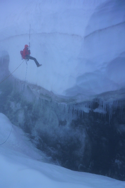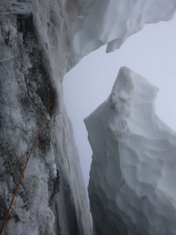 Michl querte noch eine Länge, aber bei dem dichten Nebel konnte er keinen Stand finden. Ich schaute auf die Uhr und sah, dass wir schon relativ spät dran waren und so entschied ich mich für einen Rückzug, da wir als Seilschaft sicher noch einiges an Zeit für die Tour benötigen würden. Das Abseilen war auch nochmal spannend, aber über eine fette Eissanduhr konnten wir gut über den steilen Bergschrund abseilen.