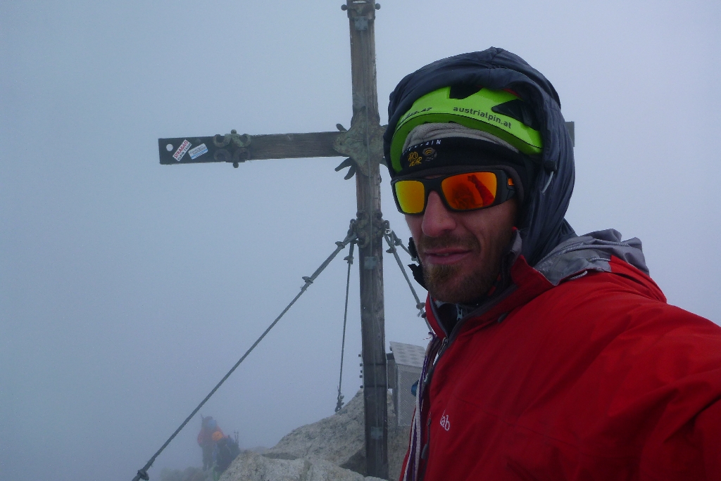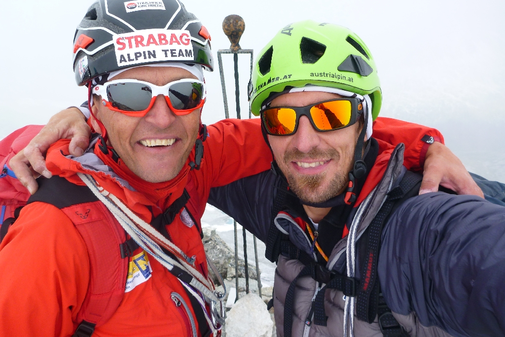 Den Olperer Gipfel wollten wir dennoch nicht auslassen und so machten wir Materialdepot und kletterten den Grat. Seile und Sicherungszeug hatten wir nicht mit, somit mussten wir seilfrei gehen, was im oberen Bereich doch spannend war. Ich kletterte alles mit den Steigeisen und in den „schwierigen“ Stellen gab es Stahlbügel. 30 Minuten später war ich auf dem Gipfel. Machte ein schnelles Foto, eine kleine Pause und trug uns ins Tourenbuch ein. Das Abklettern war auch nochmal spannend, aber ging genauso zügig.