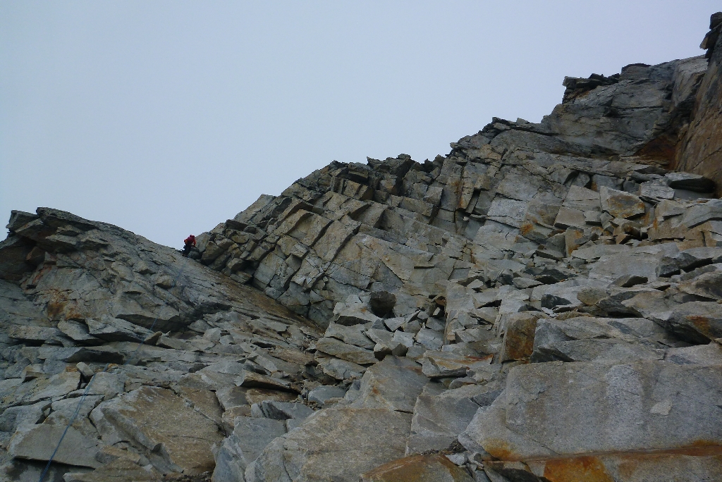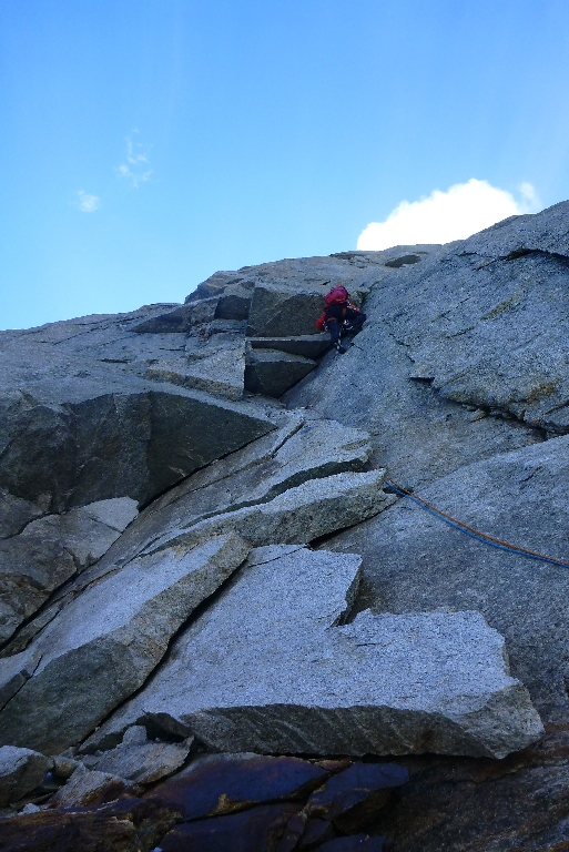 Wie immer durfte ich die erste heikle Länge führen. Anfangs noch Eis zum Granitübergang. Ich zögerte eine Weile und suchte den besten Übergang. Nach ein paar Versuchen kletterte ich rechts über den steilen Granit. Meine Steigeisen kratzten auf den rauen Granitplatten.