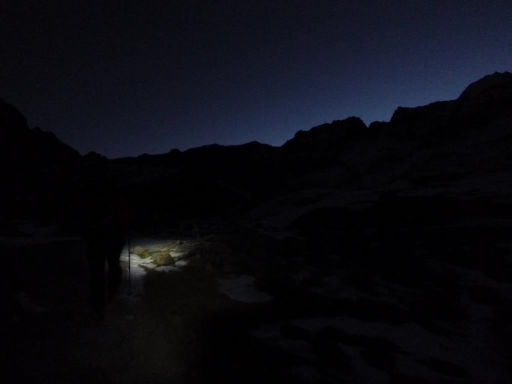 Laut Wetterprognosen war das Wetter „perfektest“ und auch der Wind bis auf 4000 m nur ganz schwach (5 km/h SW). Wir packten in der Nacht noch unsere Rucksäcke. Ein 30-Meter-Seil, Steigeisen, ein bisschen Material und den Gleitschirm. Unser Plan war die Besteigung vom Ortler (3.905m) über den Hintergrat (Ostgrat) und anschließend wollten wir uns den super mühsamen 6-Stunden-Abstieg ersparen. Kurz vor Mitternacht kamen wir in die Schlafsäcke. Nach ein paar Stunden Schlaf läutete der Wecker um 04:28. Frühstücken, ein bisschen aufwärmen, schließlich hatte es schon deutliche Minusgrade, und fertig machen. Um 05:30 starteten wir Richtung Hintergrat. Es war perfekt. Sternenklar und noch kein Schnee. Wir kamen gut voran, wobei ich merkte, dass ich nicht richtig fit war. Ich nahm etwas Tempo raus und ging gemütlich weiter. Die 3 extra Kilogramm merkte ich zwar ein wenig, aber sie machten keine Probleme.