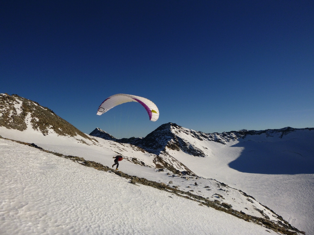 Eine kleine Skitour mit dem Schirm. Die Suldenspitze, wo Michl und ich 2014 schon mal oben waren. Diesmal aber in Kombination mit dem Gleitschirm. Wieder sind wir mit der Seilbahn raufgedüst und von der Bergstation direkt mit Skiern weggegangen. Auch hier war der Gletscher spaltenreich und es galt ein paar dicke Spalten zu überqueren. Die knappen 1600 hm waren schnell erledigt und oben am Gipfel hatten wir wieder Südwind, was heute sehr spannend werden würde.